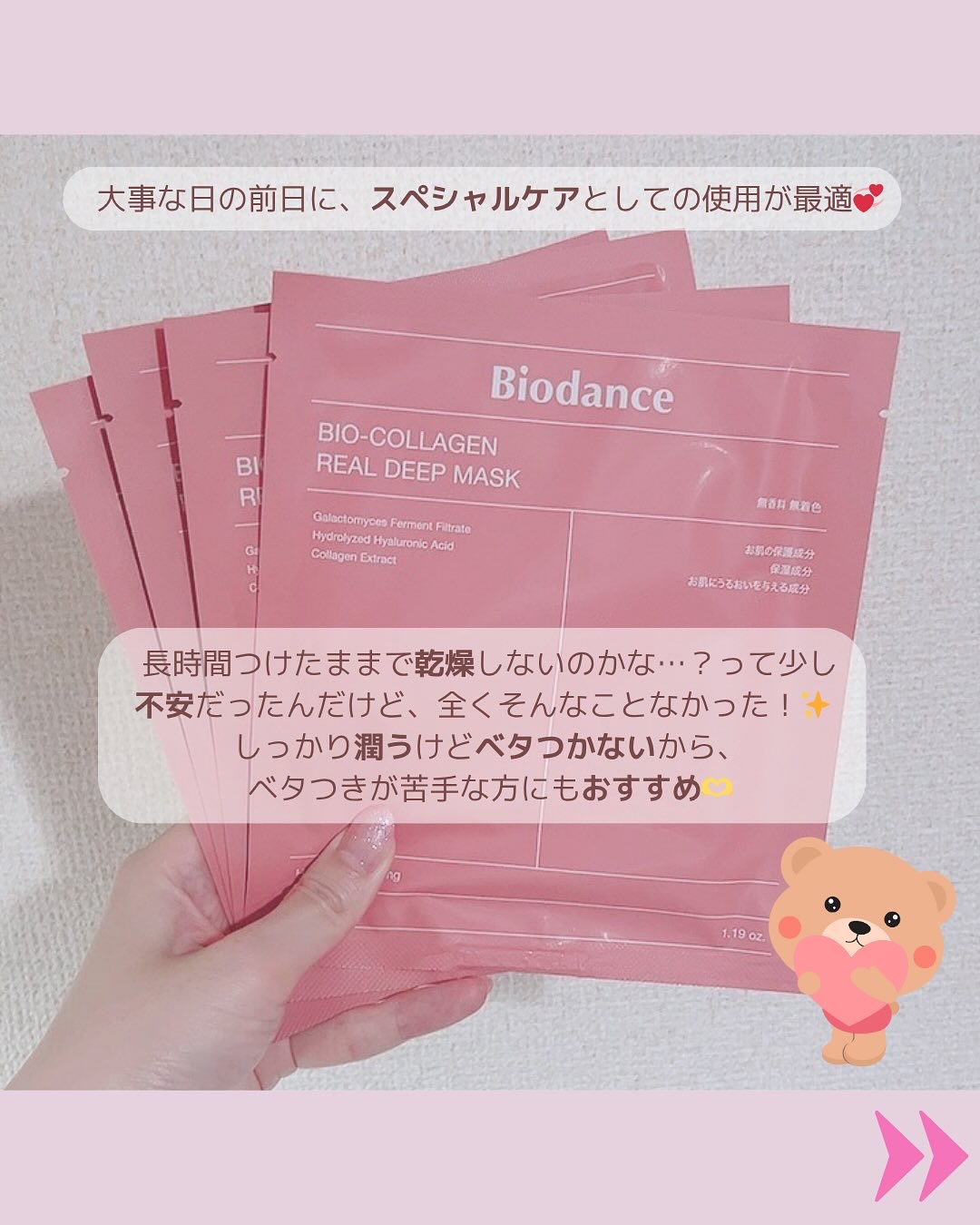 今日は、Biodanceのバイオコラーゲンリアルディープマスクを紹介します!ぷるんぷるんなパックで、お肌にピタッと密着してくれます。キメを整えなめらかな素肌へ導いてくれるスペシャルパックで、私は週1のご褒美ケアにしています。液だれもしないので...