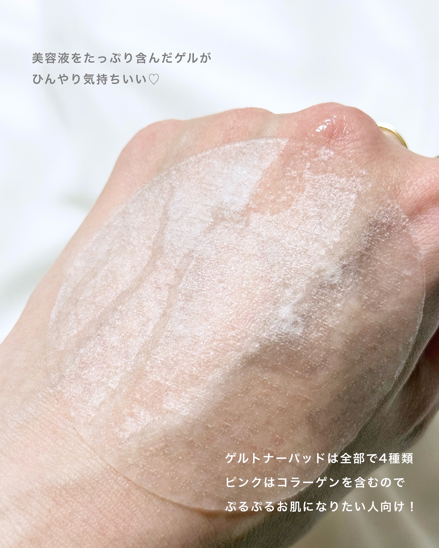 - シートをゲルでコーティングし、肌への摩擦を抑えた新感覚ゲルトナーパッド。 毛穴より小さい超低分子コラーゲンが角質層隅々まで浸透し、肌に潤いと弾力を与える効果が期待できます。(60枚入り)
