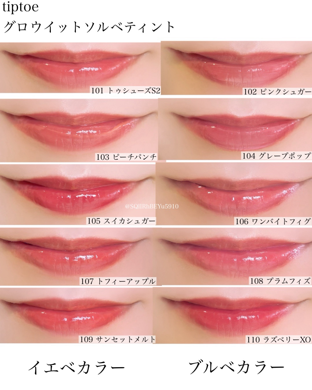 - ◇驚きのグロウイット(glowit)テクスチャー ◇ティントとリップグロスの間のテクスチャーで高持続、高着色 ◇ローズPDRN(ヴィーガンPDRN)、10種のヒアルロン酸配合(全て保湿成分) 101 トゥシューズ S2 102 ピンクシュガー 103 ピーチパンチ 104 グレープポップ 105 スイカシュガー 106 ワンバイトフィグ 107 トフィーアップル 108 プラムフィズ 109 サンセットメルト 110 ラズベリーXO 111 ナツメグガナッシュ 112 アサイードリズル