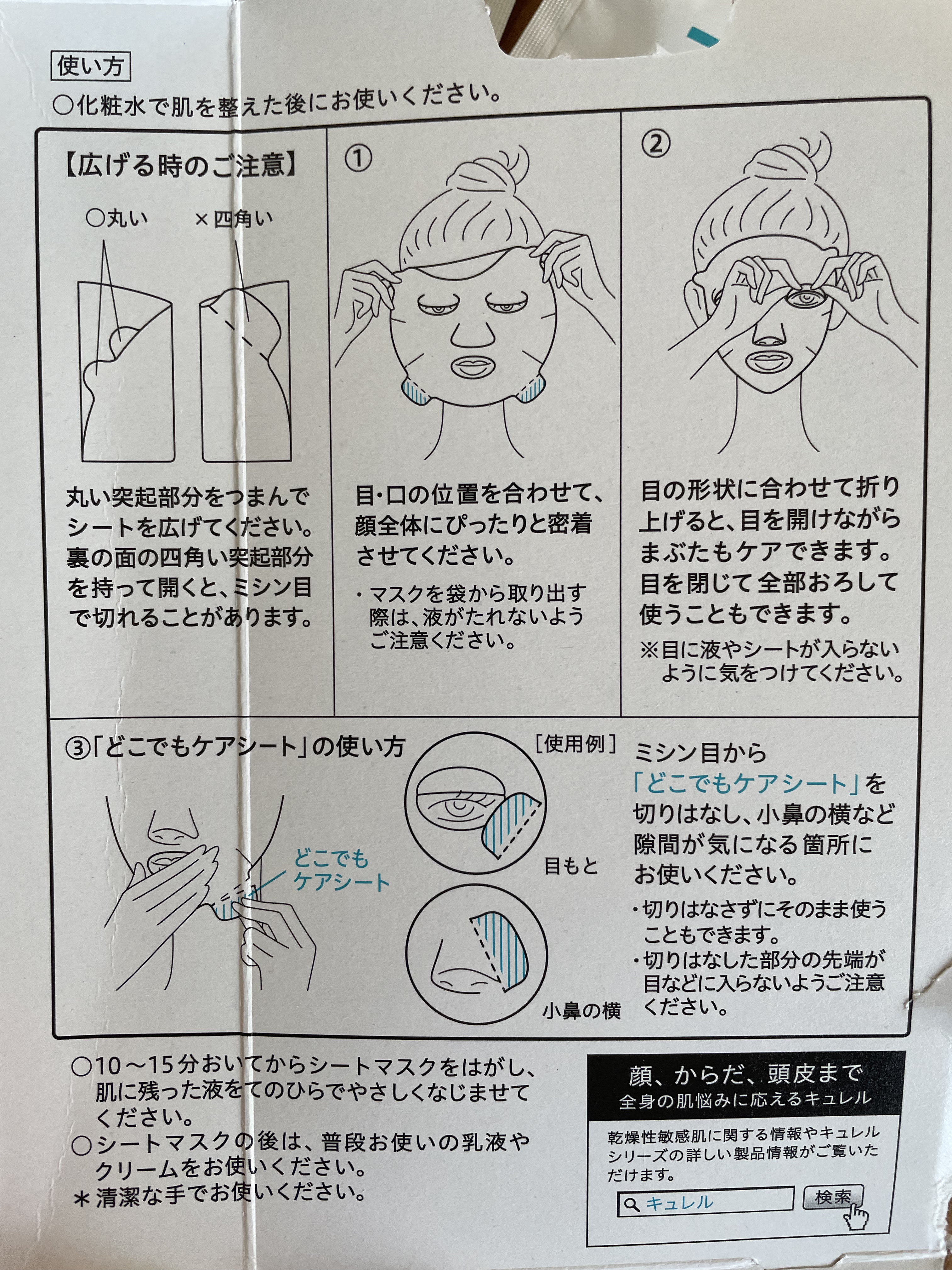 肌荒れを防ぐ消炎剤配合(有効成分) ✔️ セラミドの働きを補い、濃密な潤いをすみずみまで補給してくれるそう ✔️肌あたりやわらかなシートマスク 厚めのシートで肌あたりも良く、肌にピタッと密着してくれます。お肌が敏感な時でも優しい使い心地と、キメが整いもちっとする使用感がいいです。 マスクの下の部分は、切り離して小鼻等の隙間に貼れます。マスクのサイズによっては隙間ができるものもあるので、これも嬉しい。