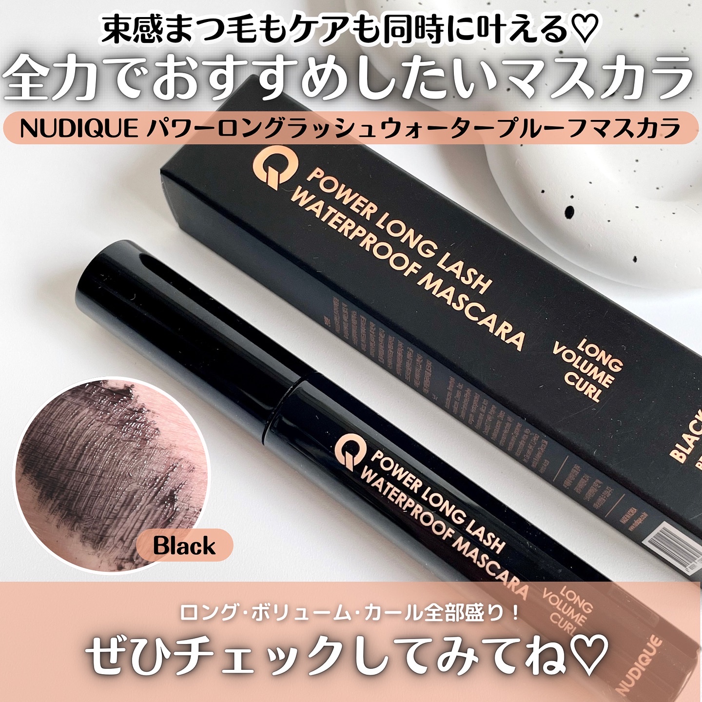 \韓国アイドルまつ毛/▶︎NUDIQUE(ヌーディーク)パワーロングラッシュウォータープルーフマスカラマツエクのようなボリューム感、長さを叶えるブラックマスカラ。特長はブラシ!まつ毛の曲線に合わせて設計されているからまつ毛に密着してキレイなセ...