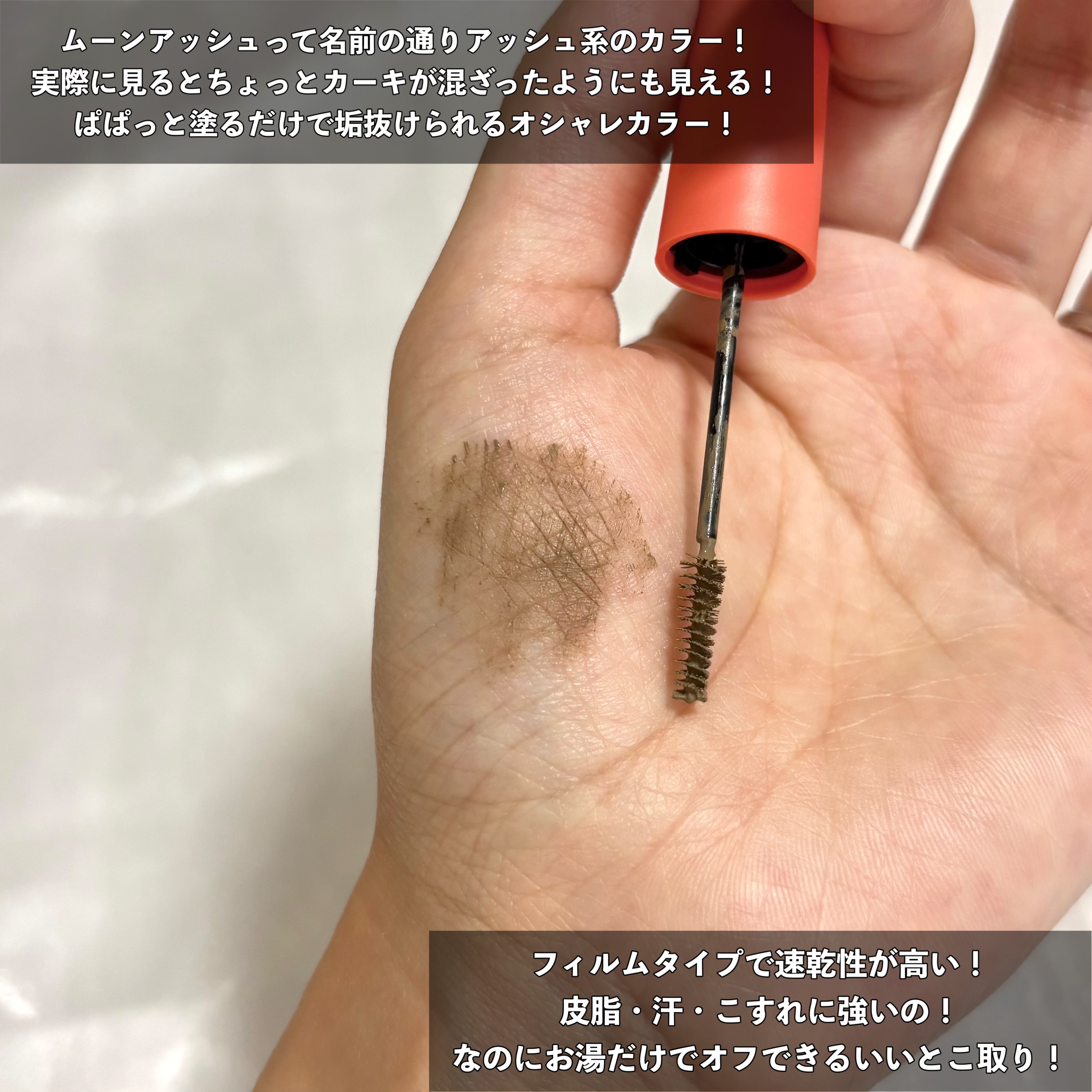 - \\25年3月定番新色モカグレージュ発売// 「フィルム眉カラー」なら眉の印象を自然にやわらげ、ふんわり質感の垢抜け眉に! 1.塗りやすい極小ブラシ ・ 先端直径3mmで、地肌に液がつきにくく根元から色づける ・余分な液がつかない設計で、ティッシュオフ不要 2.眉専用フィルム液 ・眉毛1本1本にキレイに色付き、自眉の黒さをやわらげる ・タバになったり、パリッと固まったりせず、まるで自眉のような仕上がり ・皮脂・汗・こすれに強いのにお湯で簡単オフ (※2025年9月以降、商品パッケージをリニューアル。)