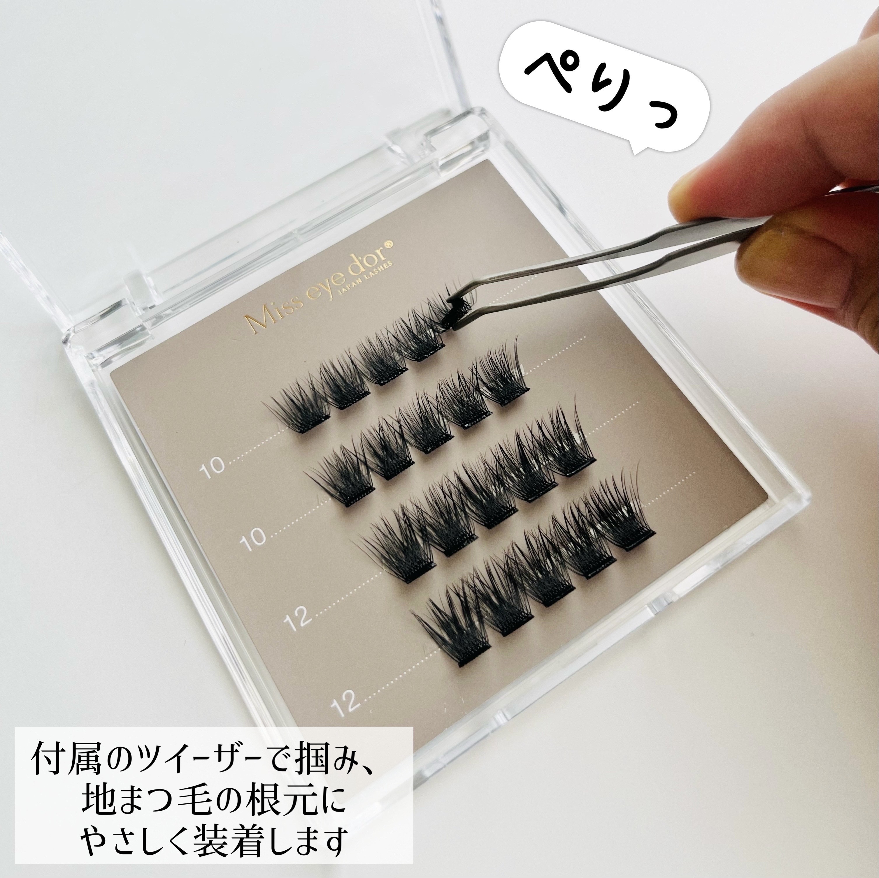 簡単に装着できる次世代つけまつ毛 1秒で付けられる、のり不要のつけまつ毛なんです𖠶𖠶 まつ毛の下からつけるので目を閉じてもわかりにくいところが🙆♀️ 初回数量限定でプロが開発したツイーザーが付いてます💓