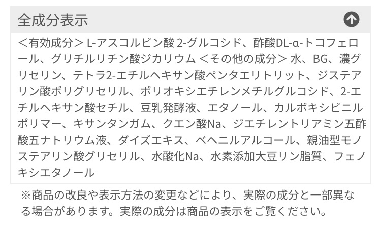 - <なめらか本舗 薬用純白乳液> L-アスコルビン酸 2-グルコシド、酢酸DL-α-トコフェロール、グリチルリチン酸ジカリウム、水、BG、濃グリセリン、テトラ2-エチルヘキサン酸ペンタエリトリット、ジステアリン酸ポリグリセリル、ポリオキシエチレンメチルグルコシド、2-エチルヘキサン酸セチル、豆乳発酵液、エタノール、カルボキシビニルポリマー、キサンタンガム、クエン酸Na、ジエチレントリアミン五酢酸五ナトリウム液、ダイズエキス、ベヘニルアルコール、親油型モノステアリン酸グリセリル、水酸化Na、水素添加大豆リン脂質、フェノキシエタノール