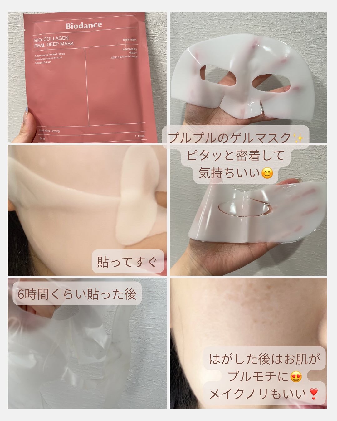 Biodanceバイオコラーゲンリアルディープマスク弾力のあるぷるぷるのハイドロゲルマスク。重厚感がありますが不思議とぴったりと密着感があります。推奨使用時間が3時間らしいのですが、貼っている間はひんやりとして気持ちがいい◎7月8日~14日の...