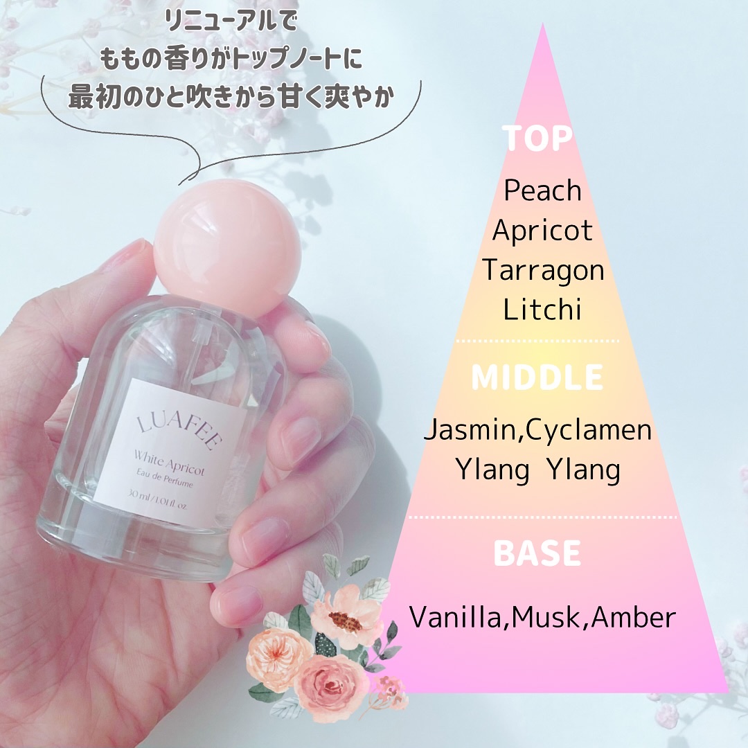 - 私だけのひととき、私を愛するための香り <香りの特徴> *ノート TOP Peach, Apricot, Tarragon, Litchi MIDDLE Jasmine, Cyclamen, Ylang Ylang LAST Vanila, Musk, Amber