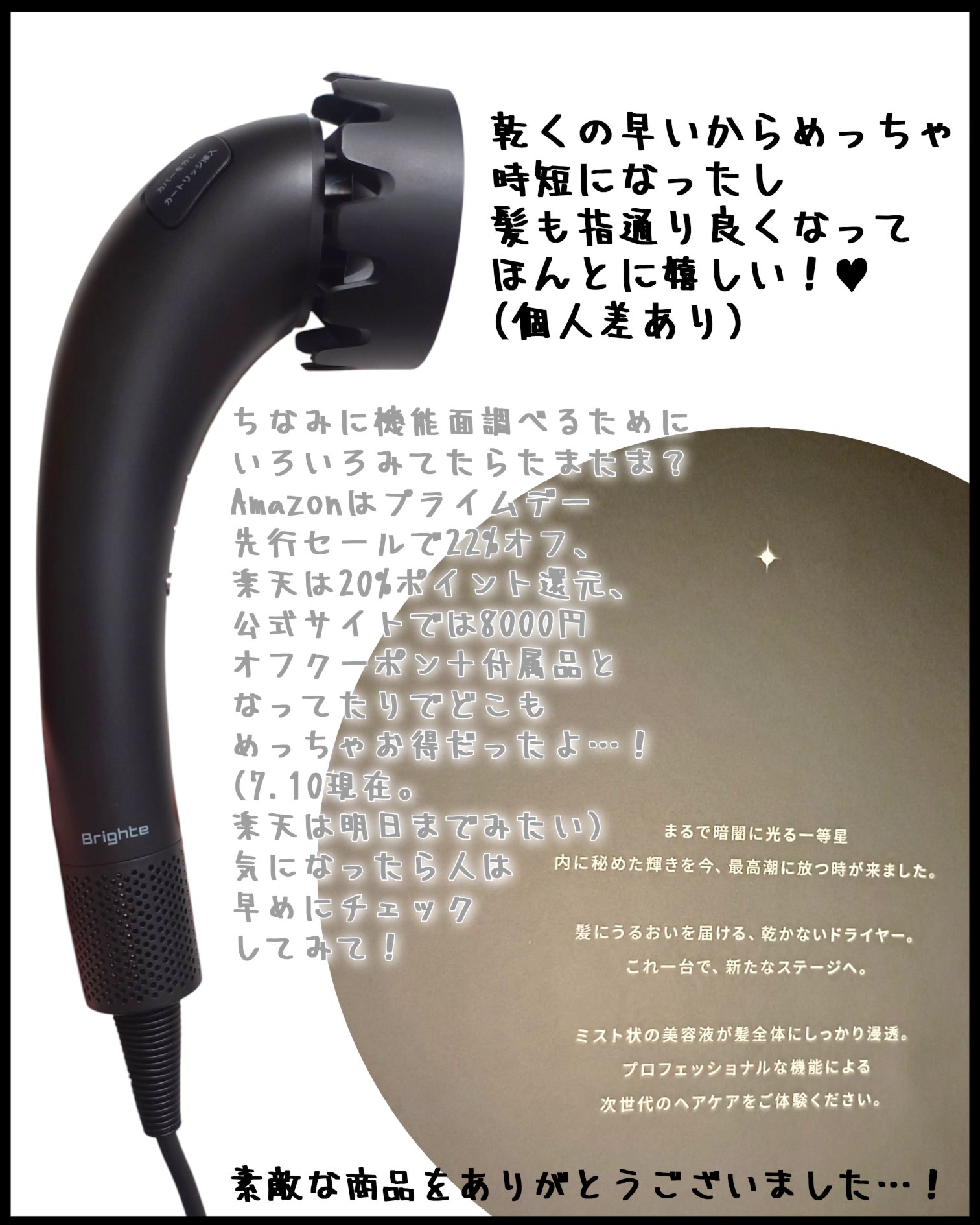 Brighte/SHOWERDRYERシャワーのような形なのですが実はドライヤーなんです💫 今まで使っていたドライヤーは重く腕が疲れるのが嫌だなと思っていたのですがこちらは軽量✨とても軽くて持ちやすい形なので髪を乾かしやすくて気に入ってい...