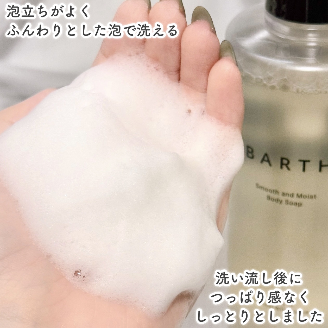 | もっちもっちの泡で体を洗った後に洗い流すだけでしっとりもちもちスベスベ肌が♡ | 詳細を見る | ||