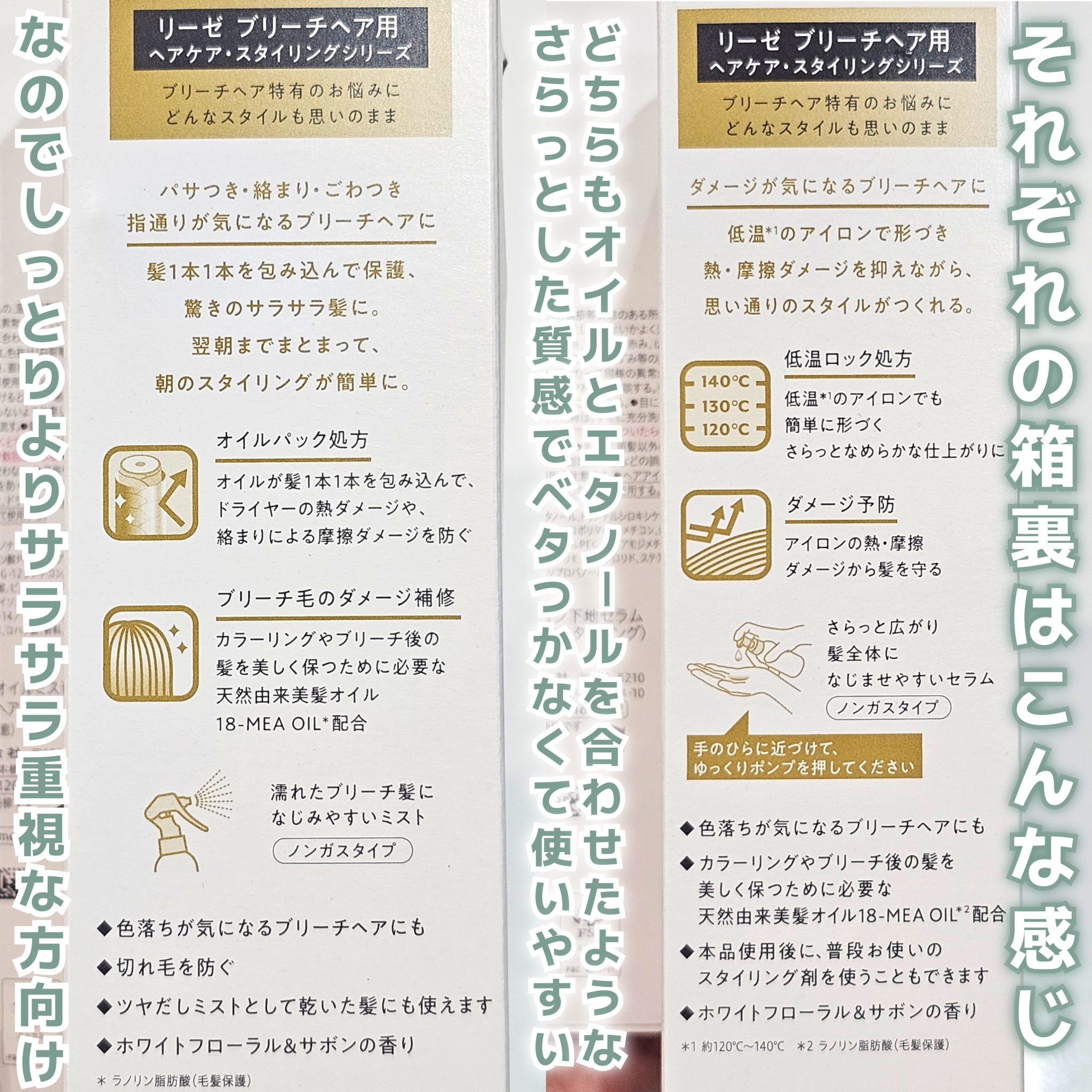 【リーゼブリーチヘア用アイロン下地セラム/リッチオイルミスト】Point1♥人気のリーゼのアイロン下地より、ブリーチ髪用が発売✨Point2♥低温で形づくから、傷みやすい髪の熱ダメージを予防できる‼️Point3♥濡れ髪に仕込むだけで即感サラ...
