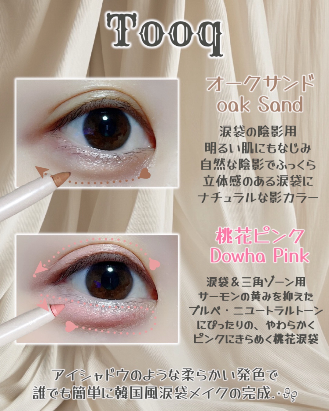 - トゥークならではの特別工法で作られたウォータープルーフ&オイルプルーフアイライナー。 2mmのスリムな厚さで繊細で完成度が高く、にじまない強力な固定力があります。 シャワー時にこすっても落ちないほど汗と油分に強いように製作してます。 カラーは全10種類で、奥ゆかしい目元表現と奥妙に見えるカラーで目元を自然に拡張してくれます。 そのうちシグネチャーカラーであるトゥークベージュは自然に目を拡張できるカラーで、粘膜に塗って切開メイクで使われます。 なめらかなつけ心地でヨレにくいです。 新カラーのトファサーモンは薄いピンクにアプリコットカラーが混ざって自然でふっくらした涙袋を作ってくれる魅力的な人気カラーです。 また、外部の空気が流入しない特許を取得したエアタイト容器で簡単に固まらず、初めて使用する時のような柔らかいつけ心地を維持してくれます。