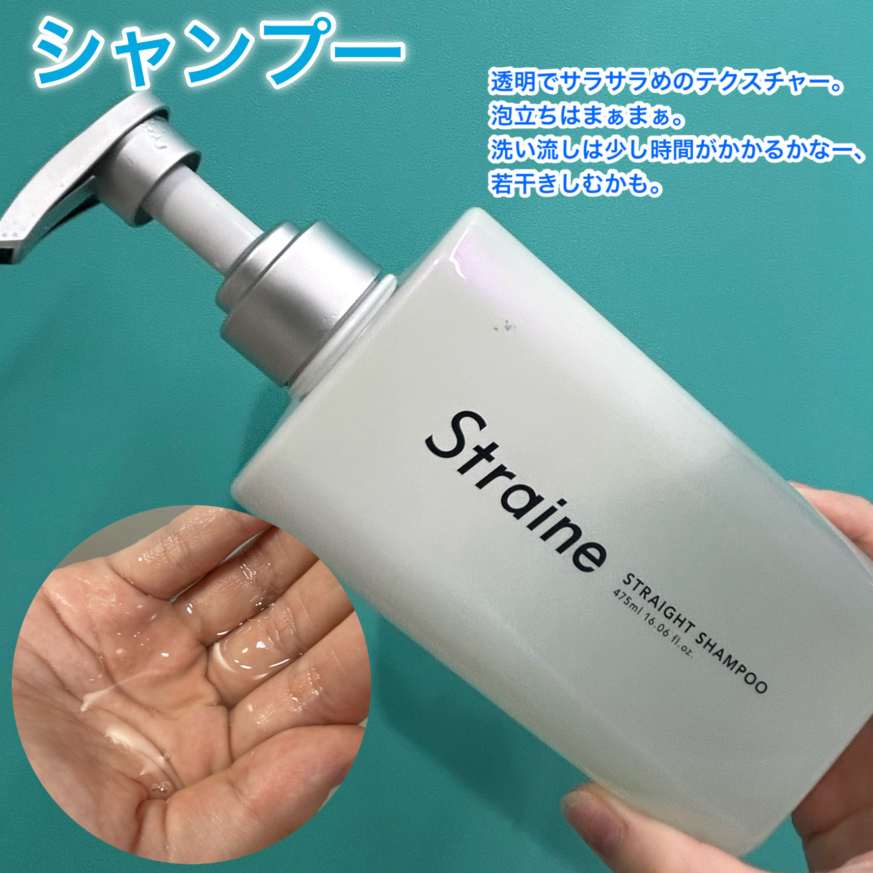 - “straight(真っ直ぐ)”と“line(線)”を組み合わせた造語「Straine」は、まるで一本の美しいラインのようにしなやかで整ったストレートヘアをイメージ。理想のストレート質感を目指し厳選した補修成分と内部構造に着目した独自の補修設計技術で、乾燥によるクセ・うねりケアに悩むすべての人へ、新しい自分との出会いをお届けする新ヘアケアブランドです。  ️髪の内部構造に着目した、独自の「トリプルストレート処方」 縮毛補修発想。髪の内側の構造に着目し、まっすぐまとまる髪を科学的に研究し導きだした3つの処方。 髪の構造を深く理解したアプローチで髪質を再整*1し、潤いを保ちながら、滑らかな指通りへ。 9種の必須アミノ酸*2と7種のケラチン*3を贅沢に配合し、髪内部を補修をしながら、理想の“シルクストレート質感*4 ”を目指します。  ️POINT01|内部補修 -髪内部のうねり原因を補修。まっすぐな髪を目指して。 髪のうねりの原因となる乾燥による内部構造の乱れを、必須アミノ酸*2を含むアミノ酸と密度補強成分「ジマレイン酸」*5で補修。さらに、縮毛補修発想から生まれた成分「トステア®」*6を配合し、ハリ・コシのあるストレート髪を目指します。  ️POINT02|シルク質感 ‐ダメージを立体補修 ダメージによって生まれた髪内部の空洞“ダメージホール”を、保湿成分である7種類の分子量の異なるケラチン*3が髪芯部まで浸透し、立体的に内側まで補修。PPT系高級洗浄成分*7が、髪1本1本を洗い上げ、しなやかで指通りなめらかな“シルクタッチ”の髪へと仕上げます。  ️POINT03|うるおいバリア ―湿気や熱から髪を守る 湿気によるうねりを防ぐために、5種のセラミド*8とサクラン®*9で髪内部の水分をキープ。さらに、熱に反応してバリアを形成する「γ-ドコサラクトン」*10と、キューティクルを保護する「擬似18-MEA」*11が外的ダメージから髪を守り、湿気から髪を保護しながらストレート状態を長時間キープします。  ️凛とした透明感が香り立つホワイトブロッサムの香り サロン帰りのような心地よさを、毎日のバスタイムに。フレッシュなフローラルと果実の爽やかさが調和した、みずみずしく上品な香りです。 *1 うるおいにより、髪の質感を整えること *2 バリン、トレオニン、イソロイシン、ヒスチジン、フェニルアラニン、ロイシン、リシンHCl、メチオニン、トリプトファン(全て保湿) *3 加水分解ケラチン(カシミヤヤギ)、ヒドロキシプロピルトリモニウム加水分解ケラチン(羊毛)、(ジヒドロキシメチルシリルプロポキシ)ヒドロキシプロピル加水分解ケラチン(羊毛)、ココジモニウムヒドロキシプロピル加水分解ケラチン(羊毛)、イソステアロイル加水分解ケラチン(羊毛)、加水分解ケラチン(羊毛)、ケラチン(全て保湿) *4 うるおいによる、なめらかな質感のこと *5 ジマレイン酸プロピレンジアンモニウム(保湿) *6 アミノエチルチオコハク酸ジアンモニウム(保湿) *7 ココイル加水分解ケラチンK(羊毛)(洗浄) *8 セラミドNG、セラミドAP、セラミドAG、セラミドNP、セラミドEOP(全て保湿) *9 スイゼンジノリ多糖体(保湿) *10 (保湿) *11 セテアラミドエチルジエトニウム加水分解コメタンパク、ラノリン脂肪酸(保湿)