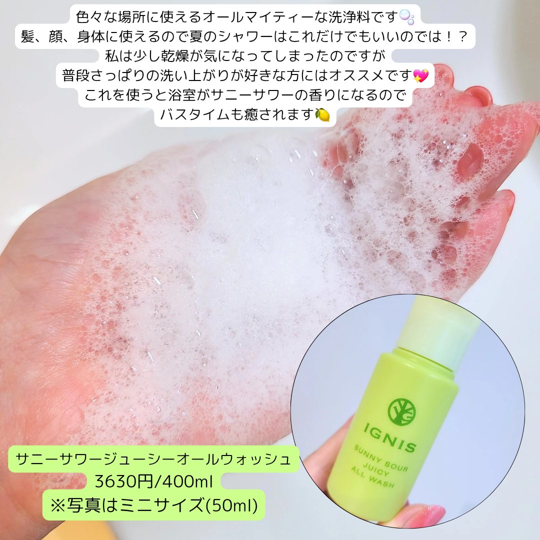 \IGNISで酷暑を乗り越えろ🍋✨/め〜っちゃ爽やかいい匂い😚✨6/17からIGNISのキャンペーン始まるよ〜!そこで今回のキャンペーン対象、サニーサワーシリーズから3つご紹介。洗顔料はベスコスも獲ってる人気アイテムで、ミストと全身洗浄料は新...