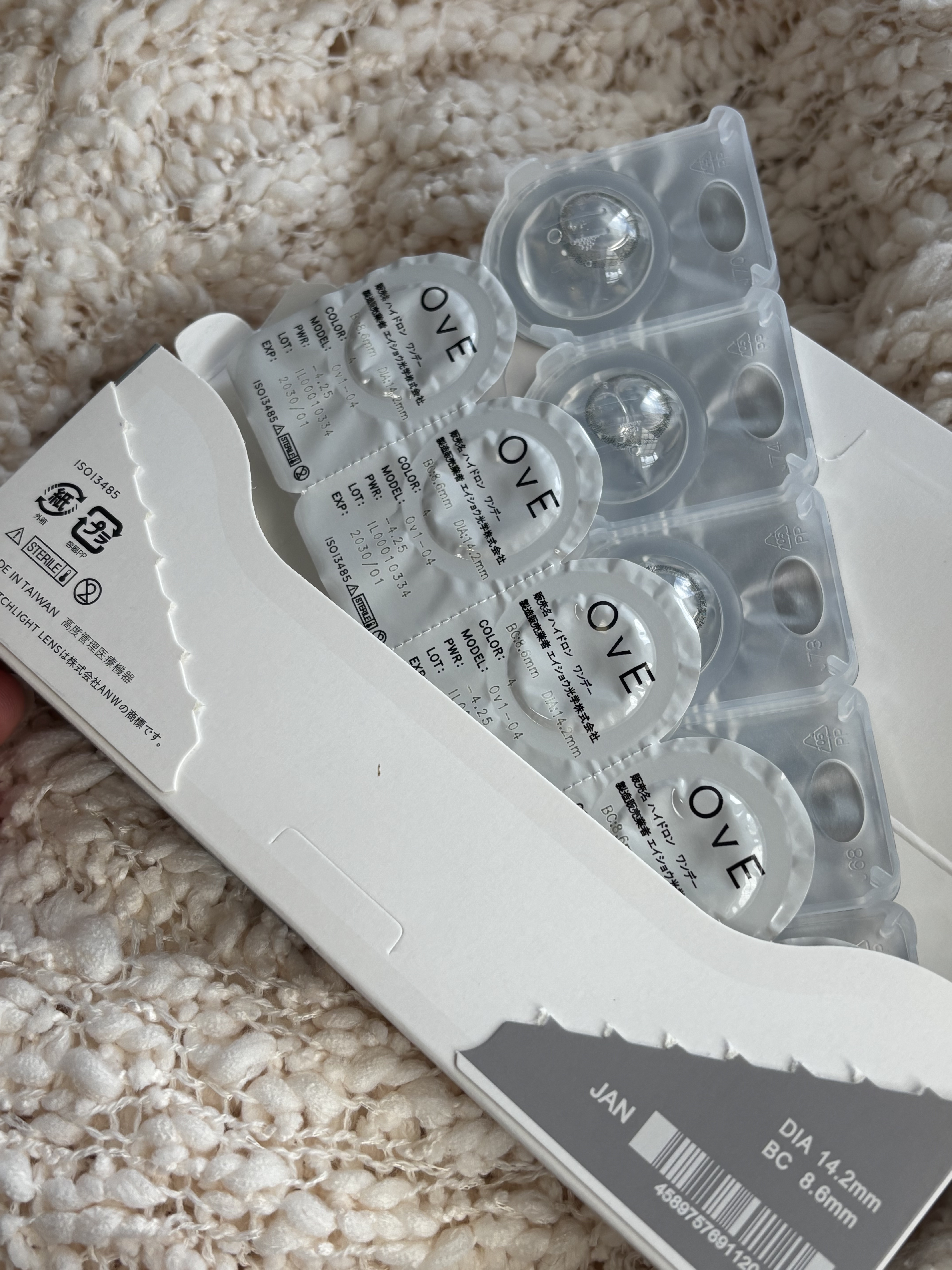- 「左右⾮対称なデザイン」で「本来の⾃分の瞳の輝きを⽣かす」「⾊」ではなく、瞳に⼊る「光」を再現した今までとは異なる発想のこだわりデザインレンズ ⿊⽬を⼤きく、瞳を⾊付けることを⽬的とした従来のカラーコンタクトレンズとは異なる発想で、瞳の中でキラキラと輝く光を表現し、透明感と潤いに溢れた瞳を実現。 繊細な⾊合いとそれを左右⾮対称に配したデザインによって、柔らかく朗らかな印象を⾃然に演出します。 発光するような瞳は、視線を集めるので⼩顔感も期待できます。 着色直径 6:12.1mm、1~4,6,7:13.0mm、5,8:14.0mm 直径(DIA) 6:14.0mm、1~4,6,7:14.2mm、5,8:14.5mm ベースカーブ 1~5,7,8:8.6mm、6:8.7mm 度数 0.00、-0.50D〜-10.00D 含⽔率 38%
