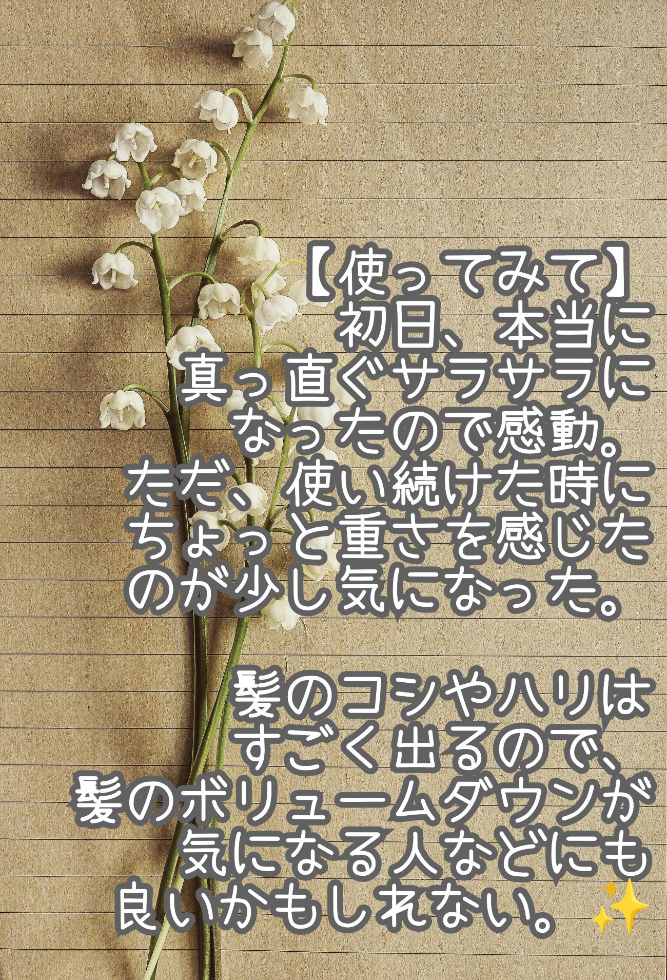 | ヘアケア・スタイリングランキング第2位 | 全体的な仕上がりは つるんと指通りが良くまとまりも良くて 個人的にはとっても好きな使用感です! | 詳細を見る | |