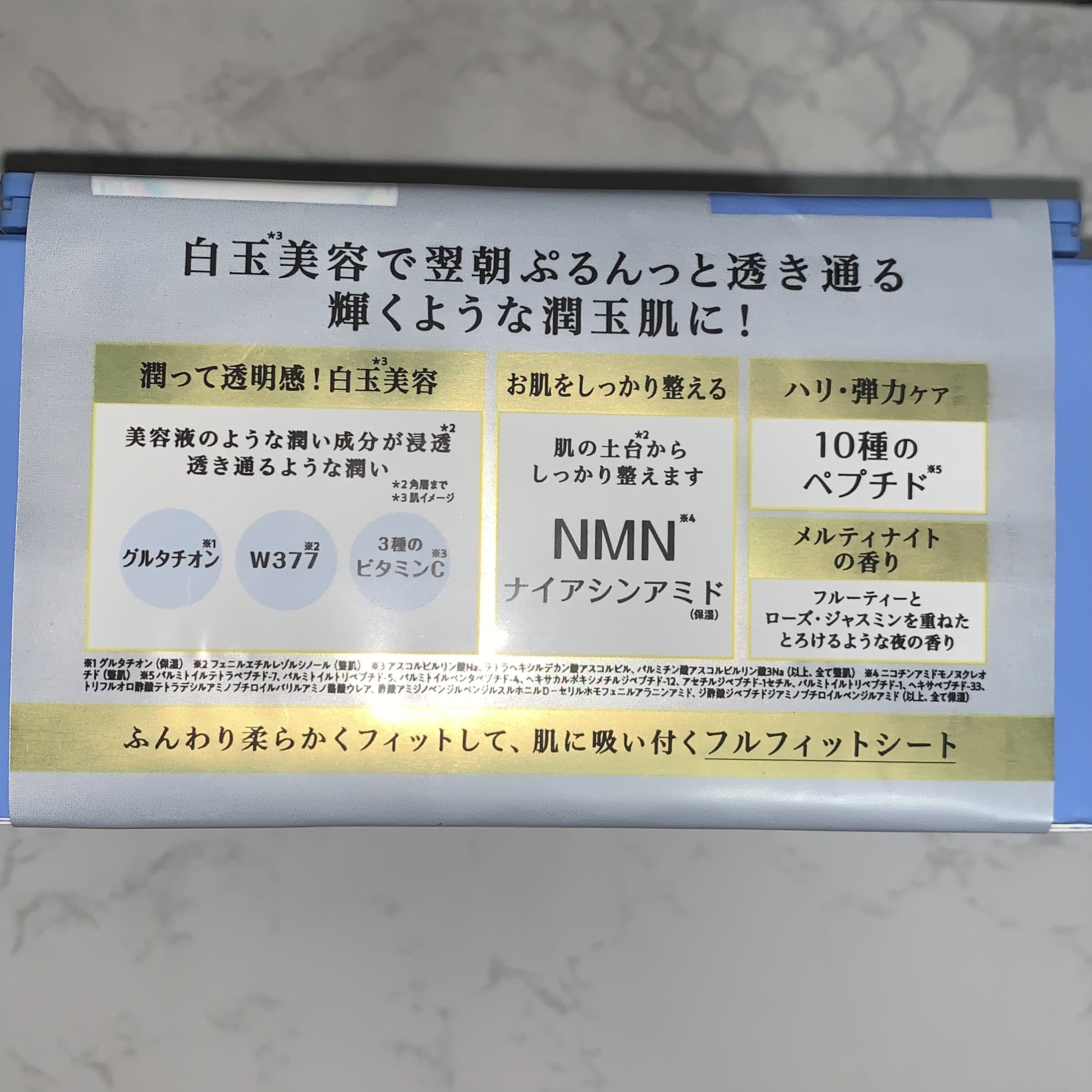 - 夜3分*1 の白玉*2 美容マスクでぷるんっと透き通る、 潤玉肌に ●おやすみ前はこれ1枚!オールインワン処方マスク 化粧水+乳液+美容液+クリーム+パック ●潤って透明感!白玉美容 【グルタチオン*3】 アミノ酸からなる成分で、美しく透明感のある肌に 【W377*4】 ドイツで開発された整肌成分 【3種のビタミンC*5】 ビタミンC誘導体採用 ●10種のペプチドが肌に浸透*6 し、ふっくらとしたハリ肌へ。 ふっくらとしたハリやキメを整えます。 ・パルミトイルテトラペプチド-7・パルミトイルトリペプチド-5 ・パルミトイルペンタペプチド-4・アセチルジペプチド-1セチル ・ヘキサカルボキシメチルジペプチド-12・パルミトイルトリペプチド-1 ・トリフルオロ酢酸テトラデシルアミノブチロイルバリルアミノ酪酸ウレア ・酢酸アミジノベンジルベンジルスルホニルD-セリルホモフェニルアラニンアミド ・ジ酢酸ジペプチドジアミノブチロイルベンジルアミド・ヘキサペプチド-33 (以上、全て保湿) ●ナイアシンアミド配合で、肌のベース*6 からアプローチ 保湿成分としてナイアシンアミド、NMN*7 を配合ししっかりと潤いで満たします。 NMN*7 ・ナイアシンアミド(保湿) ●メルティナイトの香り *1 使用時間目安 *2 肌イメージ *3 グルタチオン(保湿) *4 フェニルエチルレゾルシノール(整肌) *5 アスコルビルリン酸Na、テトラヘキシルデカン酸アスコルビル、パルミチン酸アスコルビルリン酸3Na(以上、全て整肌) *6 角層まで *7 ニコチンアミドモノヌクレオチド(整肌)