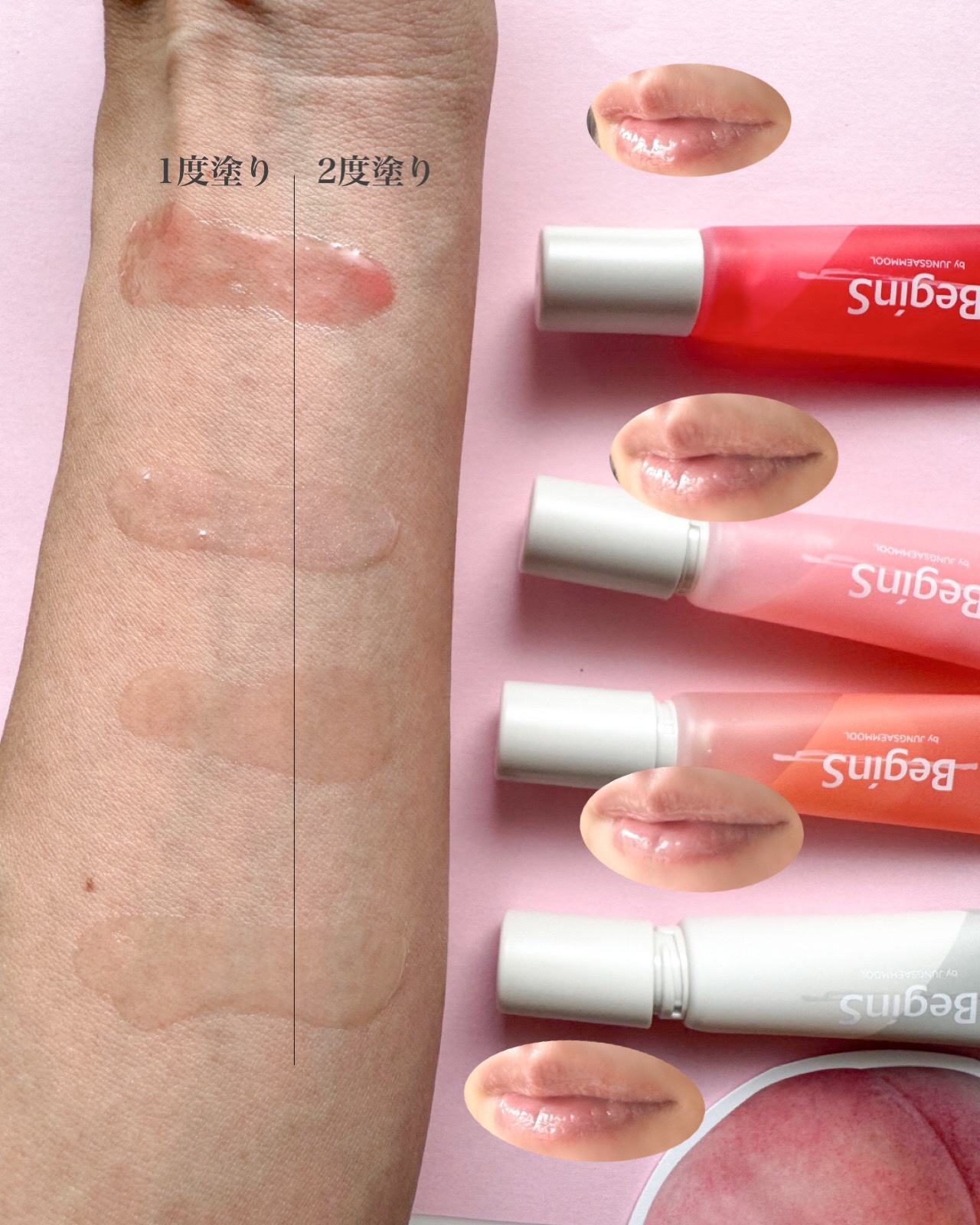 まるでぷるぷる果実のくちびる🍓🍑🍇Begins👄リップケアカラーオイルぷるっとみずみずしいフルーツカラーでほんのりナチュラルでぷっくりした唇に仕上がるよ✨ダブルロッキングキャップで液漏れも防止してくれるからポーチに入れても安心🤍ぷにぷにシリコ...