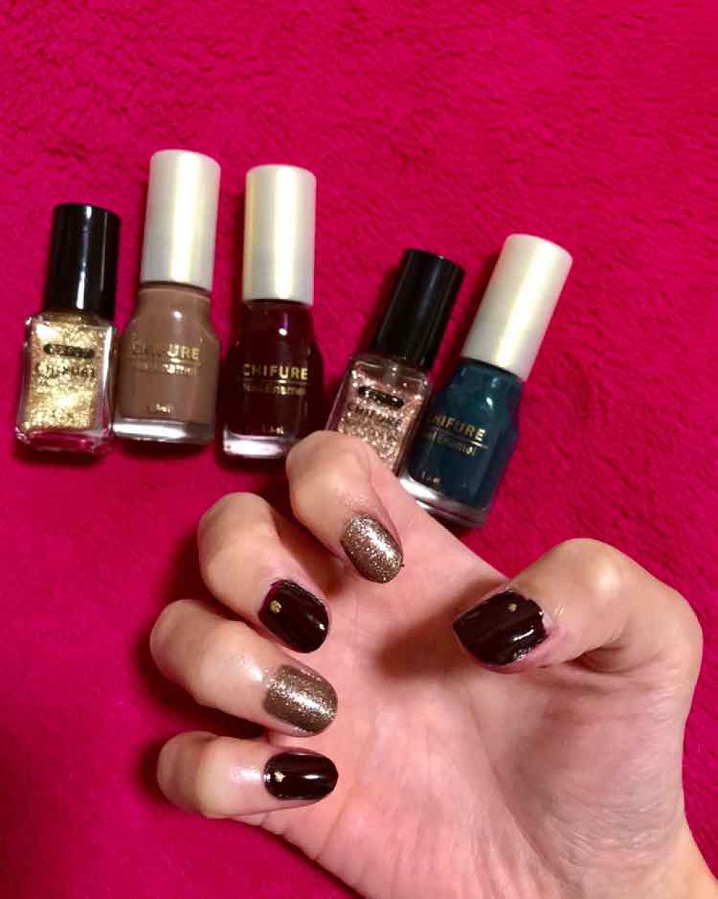 ちふれのネイルといえば💅りんご飴風なんが有名ですが…ニベアのボルドーリップとGUの深いグリーンのスエットと合わせるネイルを見つけました!!!!ちふれのネイル紹介370ベースに006のゴールドをちょこんと乗せました。370のボルドーは、こってり...