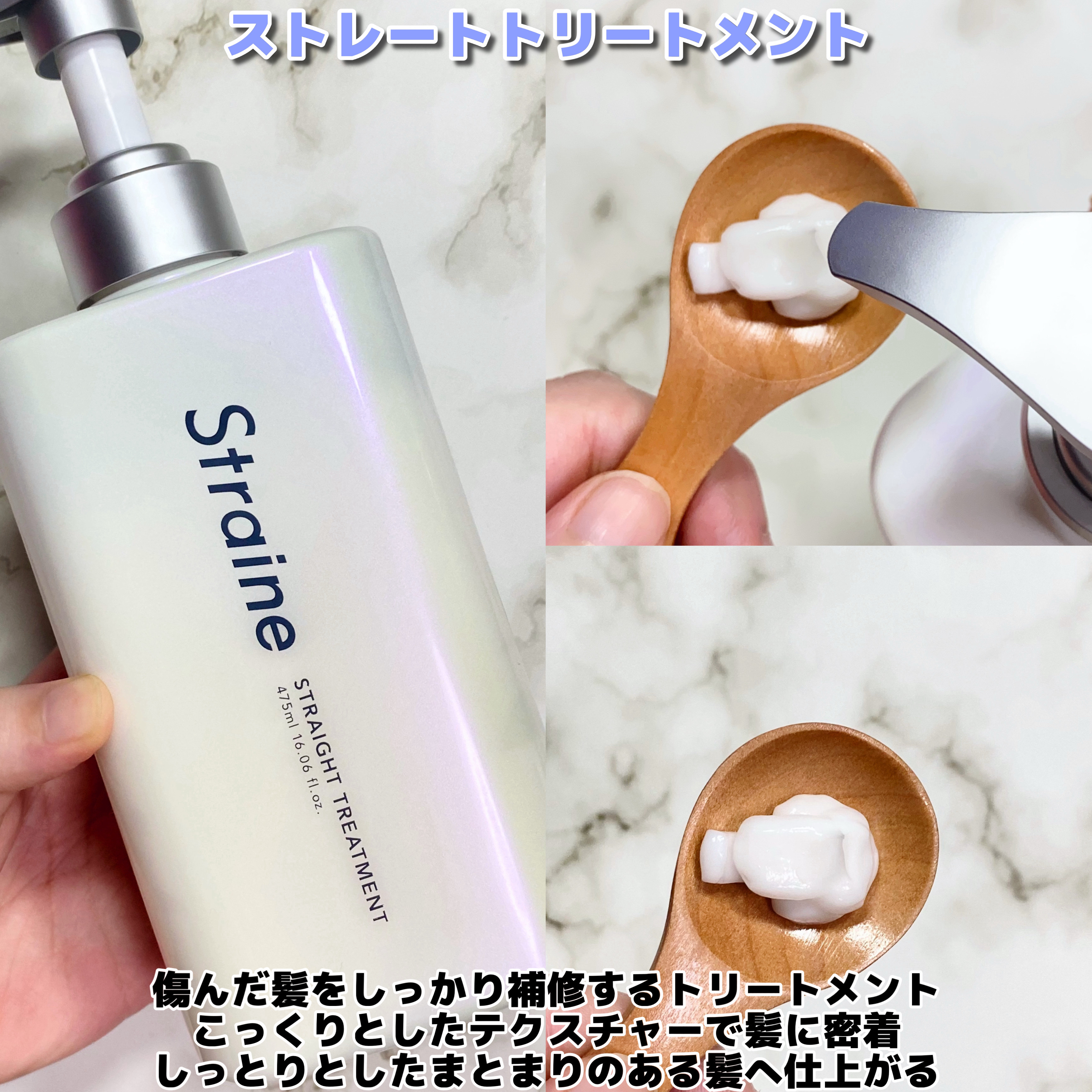 - “straight(真っ直ぐ)”と“line(線)”を組み合わせた造語「Straine」は、まるで一本の美しいラインのようにしなやかで整ったストレートヘアをイメージ。理想のストレート質感を目指し厳選した補修成分と内部構造に着目した独自の補修設計技術で、乾燥によるクセ・うねりケアに悩むすべての人へ、新しい自分との出会いをお届けする新ヘアケアブランドです。  ️髪の内部構造に着目した、独自の「トリプルストレート処方」 縮毛補修発想。髪の内側の構造に着目し、まっすぐまとまる髪を科学的に研究し導きだした3つの処方。 髪の構造を深く理解したアプローチで髪質を再整*1し、潤いを保ちながら、滑らかな指通りへ。 9種の必須アミノ酸*2と7種のケラチン*3を贅沢に配合し、髪内部を補修をしながら、理想の“シルクストレート質感*4 ”を目指します。  ️POINT01|内部補修 -髪内部のうねり原因を補修。まっすぐな髪を目指して。 髪のうねりの原因となる乾燥による内部構造の乱れを、必須アミノ酸*2を含むアミノ酸と密度補強成分「ジマレイン酸」*5で補修。さらに、縮毛補修発想から生まれた成分「トステア®」*6を配合し、ハリ・コシのあるストレート髪を目指します。  ️POINT02|シルク質感 ‐ダメージを立体補修 ダメージによって生まれた髪内部の空洞“ダメージホール”を、保湿成分である7種類の分子量の異なるケラチン*3が髪芯部まで浸透し、立体的に内側まで補修。PPT系高級洗浄成分*7が、髪1本1本を洗い上げ、しなやかで指通りなめらかな“シルクタッチ”の髪へと仕上げます。  ️POINT03|うるおいバリア ―湿気や熱から髪を守る 湿気によるうねりを防ぐために、5種のセラミド*8とサクラン®*9で髪内部の水分をキープ。さらに、熱に反応してバリアを形成する「γ-ドコサラクトン」*10と、キューティクルを保護する「擬似18-MEA」*11が外的ダメージから髪を守り、湿気から髪を保護しながらストレート状態を長時間キープします。  ️凛とした透明感が香り立つホワイトブロッサムの香り サロン帰りのような心地よさを、毎日のバスタイムに。フレッシュなフローラルと果実の爽やかさが調和した、みずみずしく上品な香りです。 *1 うるおいにより、髪の質感を整えること *2 バリン、トレオニン、イソロイシン、ヒスチジン、フェニルアラニン、ロイシン、リシンHCl、メチオニン、トリプトファン(全て保湿) *3 加水分解ケラチン(カシミヤヤギ)、ヒドロキシプロピルトリモニウム加水分解ケラチン(羊毛)、(ジヒドロキシメチルシリルプロポキシ)ヒドロキシプロピル加水分解ケラチン(羊毛)、ココジモニウムヒドロキシプロピル加水分解ケラチン(羊毛)、イソステアロイル加水分解ケラチン(羊毛)、加水分解ケラチン(羊毛)、ケラチン(全て保湿) *4 うるおいによる、なめらかな質感のこと *5 ジマレイン酸プロピレンジアンモニウム(保湿) *6 アミノエチルチオコハク酸ジアンモニウム(保湿) *7 ココイル加水分解ケラチンK(羊毛)(洗浄) *8 セラミドNG、セラミドAP、セラミドAG、セラミドNP、セラミドEOP(全て保湿) *9 スイゼンジノリ多糖体(保湿) *10 (保湿) *11 セテアラミドエチルジエトニウム加水分解コメタンパク、ラノリン脂肪酸(保湿)