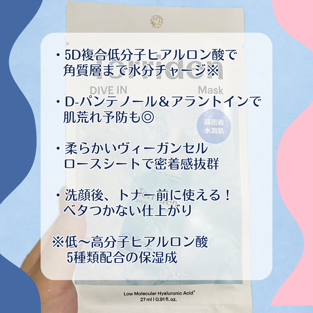 保湿感がお気に入りでリピート買いしました🌿 乾燥した肌に水分チャージ Lヒアルロン酸が肌の角質層まで素早く浸透 大人気trridenのダイブインセラム美容液がたっぷり吸収されたパック🫶🏻 より肌に行渡るよう分子サイズの異なる5D複合低分子ヒアルロン酸が配合され、肌にぐんぐんと水分をチャージしてくれます🫧 とにかく保湿・・・!といった使用感なので、冬場の使用や乾燥肌の方にオススメ♡