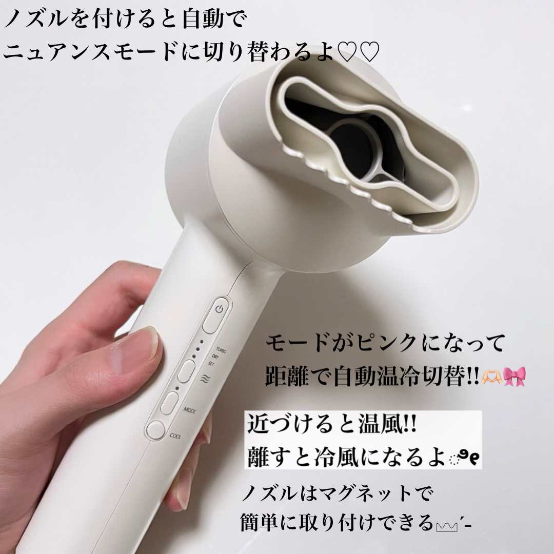 フェスティノさまからいただきました。◆ツヤニュアンスドライヤー(color:サンドベージュ)業界初※のニュアンスドライモードを搭載!独自の「ニュアンスノズル」をつけると、ドライヤーと髪の距離を感知して自動で温度を切り替える。ドライヤーを髪に近...