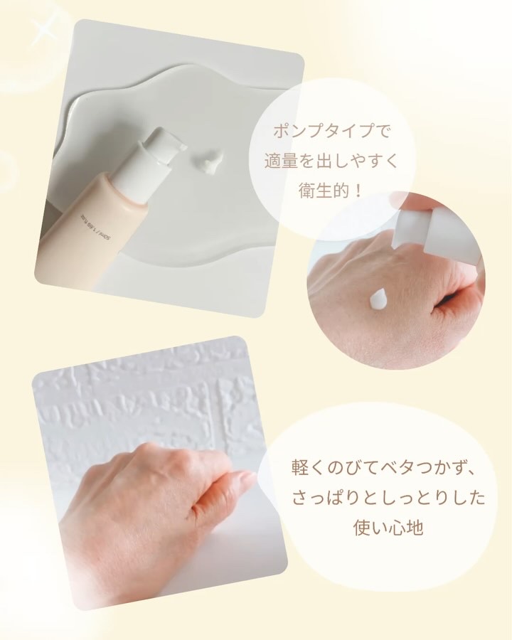 | 肌表面をしっかり潤いで包んでくれるような塗り心地で、 ベタつきすぎないので首元にも使いやすい! | 詳細を見る | ||