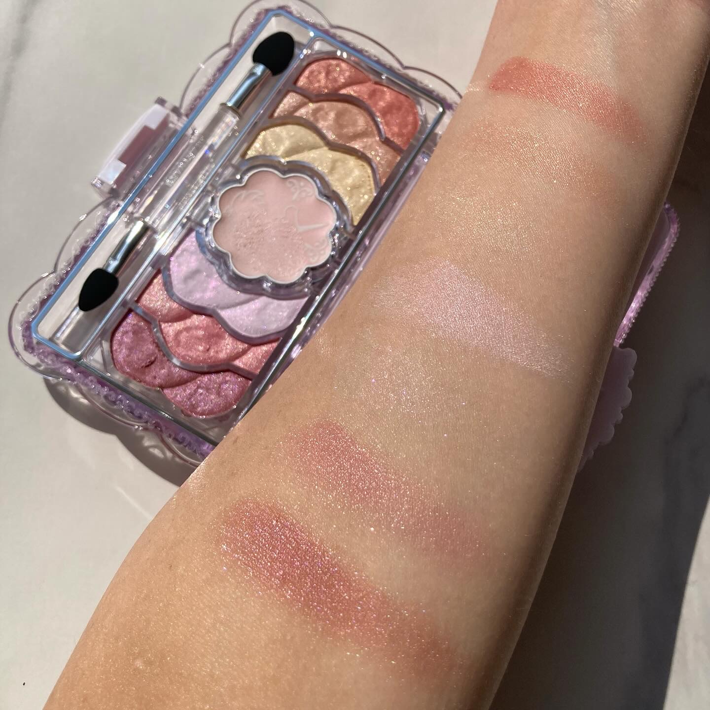 マットは肌に溶け込むような粉質でボソボソしません! シマーのしっとりした粉質も密着してくれて好き!!! 1番キラキラなのは右上のラメですね🍑💓でも粒が大きくないので、大人も使いやすいラメだと思います🥰 どの色使おうか迷うけど、どれ使っても本当可愛くて、自分が桃になったかのような🍑(笑)多幸感あふれるパレットです💘