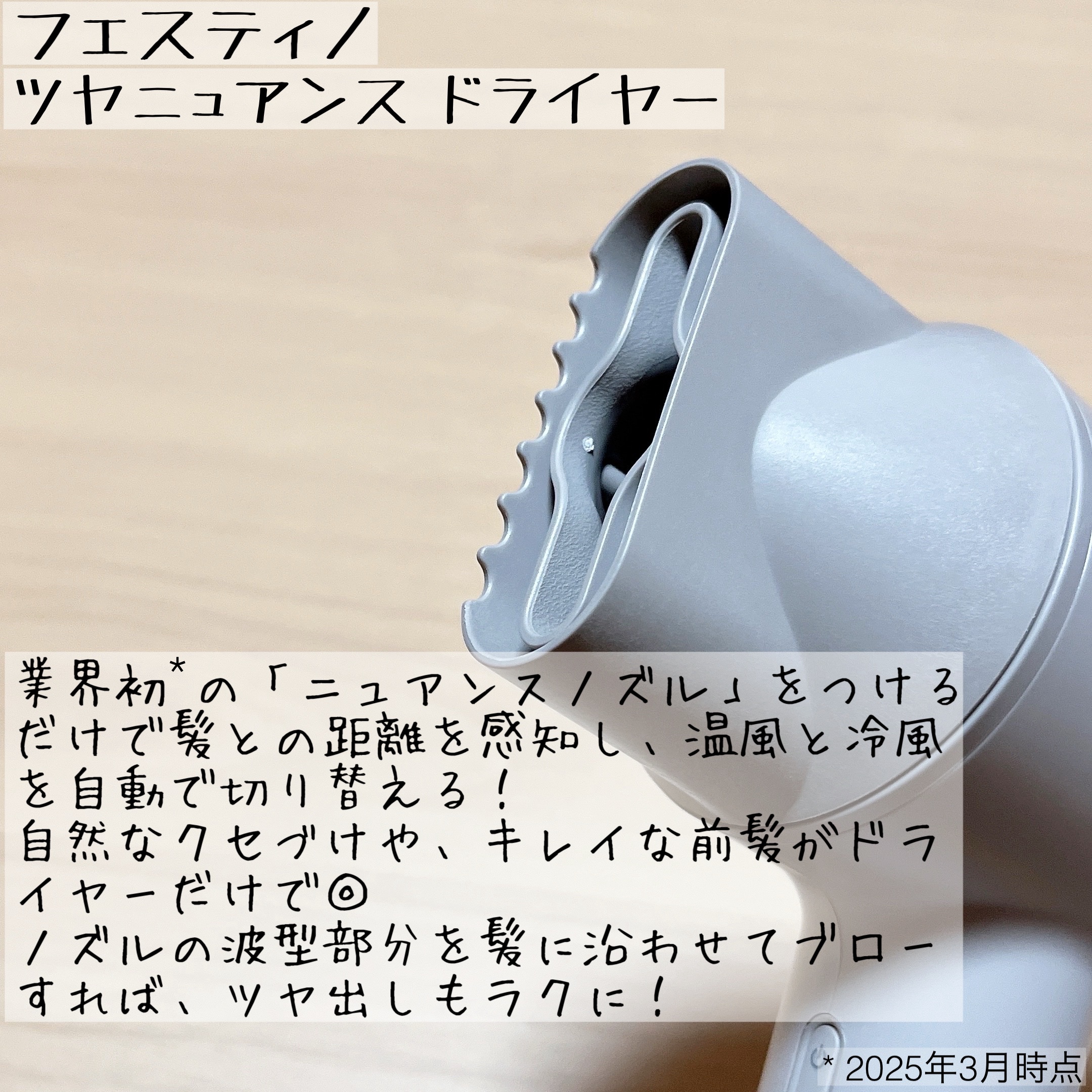フェスティノさまからいただきました𓂃業界初*の"ニュアンスノズル"をつけるだけで髪との距離を感知し、温風と冷風を自動で切り替えてくれるツヤニュアンスドライヤー🥹🤍「乾かす」だけじゃなく「仕上げ」まで同時に🪞6つのモードがあって、私はツヤMOD...