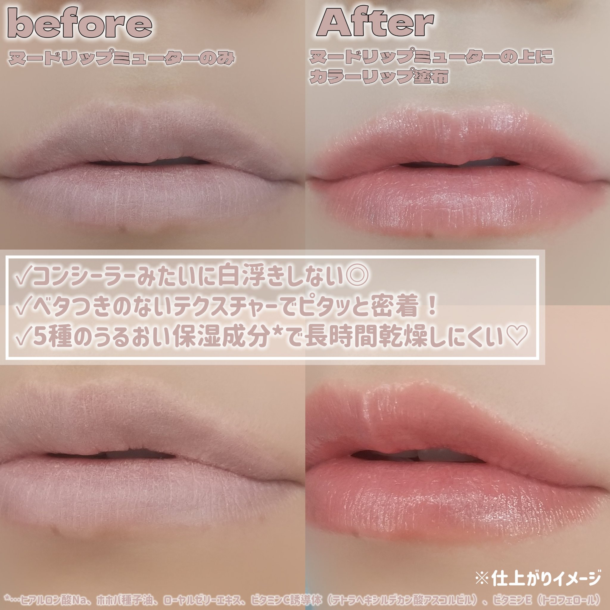 - 元のくちびるの色をミュートする 新発想のくちびる用下地 ●濃い色の唇の存在感を抑えて、生まれつきかのような淡い色のヌードリップに。 ●その後に重ねる口紅と混ざりづらく、ぴたっと密着。 ●チップで唇に伸ばした後は、トントンと指でなじませるだけで簡単に唇の色を補正。 ●唇の縦ジワをかくしてふっくらとした唇に。 ●5 種のうるおい美容成分で唇の乾燥を防ぎます。 ヒアルロン酸 Na・ホホバ種子油・ローヤルゼリーエキス・ビタミン C 誘導体(テトラへキシルデカン酸アスコルビル)・ビタミン E(トコフェロール) ●無香料 <このような方にオススメ> ■素のくちびる色が赤っぽい ■淡色リップが似合わない ■どのリップも同じ色になる <ご使用法> ■リップメイクの前に。チップに適量を取り、唇に塗布してください。 ■チップで唇全体に広げた後、指でトントンと軽くたたきこむようになじませるとより自然に仕上がります。