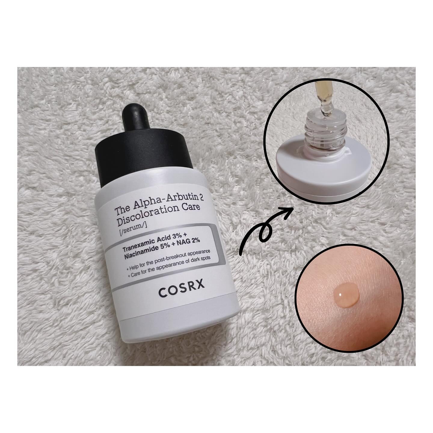 COSRXシミ・トラブル跡・色素沈着などをケアし明るい肌へと導くアイテム。【RXザ・アルファアルブチン2ニキビ跡ケアセラム】茶色のウォータリーテクスチャー。みずみずしい使用感で肌にスーッとなじみベタつきは感じません。毎日重ね付けしながら肌...