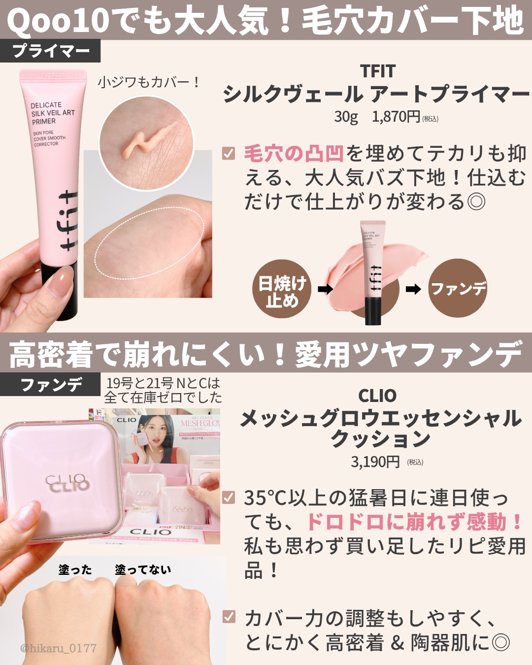 この中でも、ご相談いただいた時にまずオススメするのがジョンセンムル🙌 カラーや肌質など、ご自身にあったものを選べるのですが、私はトーンアップを使ってます💕 全体的なバランスが良いので、ひかるの中でも使用頻度が高いアイテムです💪✨ パパパッとメイクを済ませたいときや、ノーファンデな日にはナンバーズイン😍 これあると便利ですよ〜💓 商品名の通り、陶器肌に仕上がるし、マスクに本当に付きにくい✨ 保湿力やツヤ感、テクスチャーやカバー力など、それぞれ星や画像を参考に比較して、お買い物の参考に少しでもなれば嬉しいです🙌💕