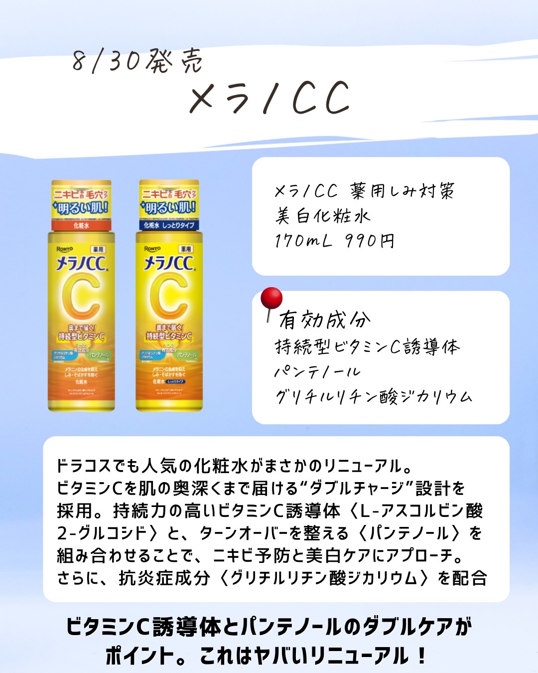 肌が荒れた時にビタミンCがいいとSNSで見かけたというフォロワーさんがいたけど、これは本当に辞めてほしい(濃度にもよるけど) ビタミンCは攻めのケアでもあるから、肌が敏感な時には避けてほしい。 でも、メラニン予防とか毛穴ケアには本当に良い商品でもあると思うから、使い方を間違えずに選択してほしいな!!