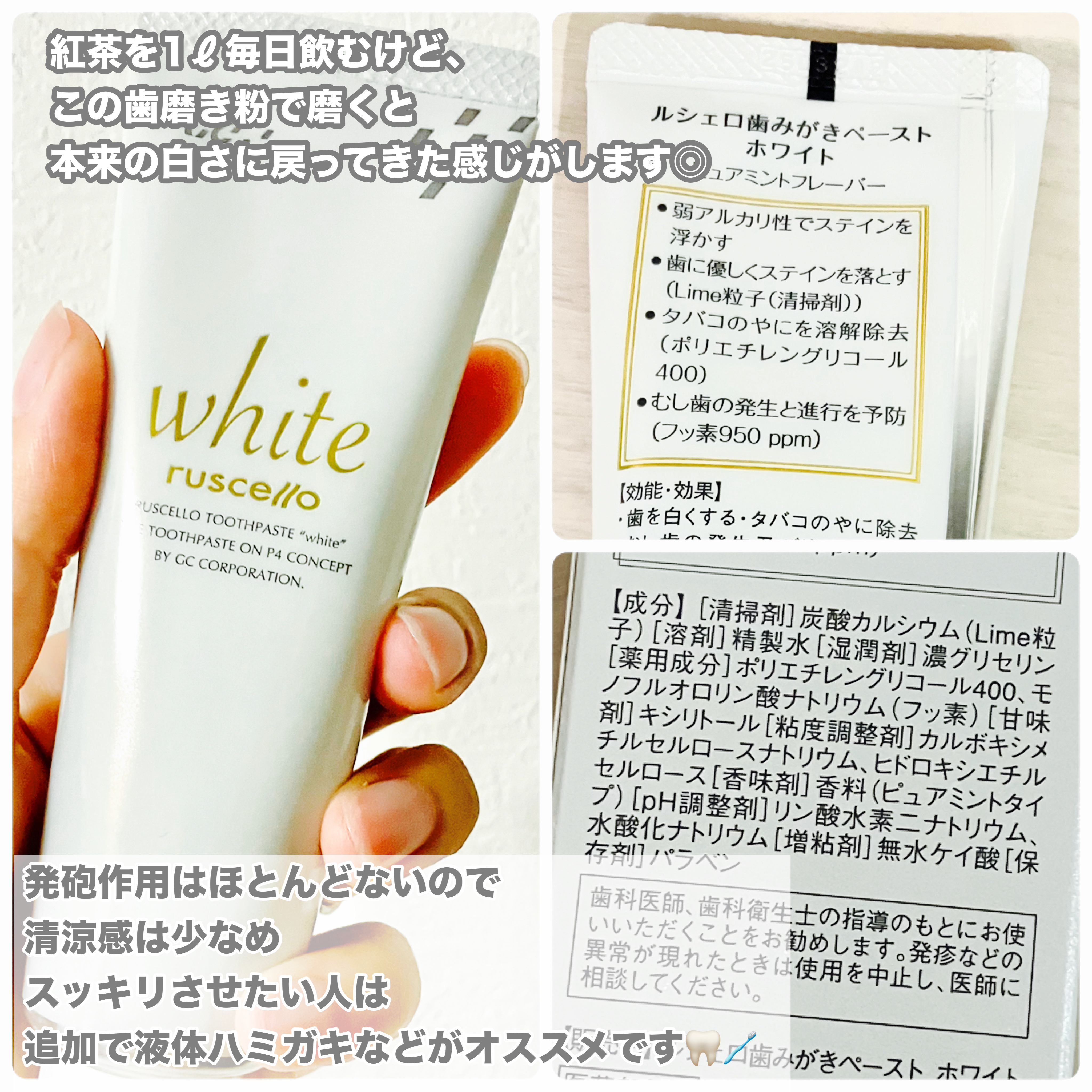 - [清掃剤]炭酸カルシウム(Lime粒子) [溶剤]精製水 [湿潤剤]濃グリセリン [薬用成分]ポリエチレングリコール(PEG)400、モノフルオロリン酸ナトリウム(フッ素) [甘味剤]キシリトール [粘結剤]ヒドロキシエチルセルロース、カルボキシメチルセルロースナトリウム [香味剤]香料(ピュアミントタイプ) [ph調整剤]リン酸水素二ナトリウム、水酸化ナトリウム [増粘剤]無水ケイ酸 [保存剤]パラベン