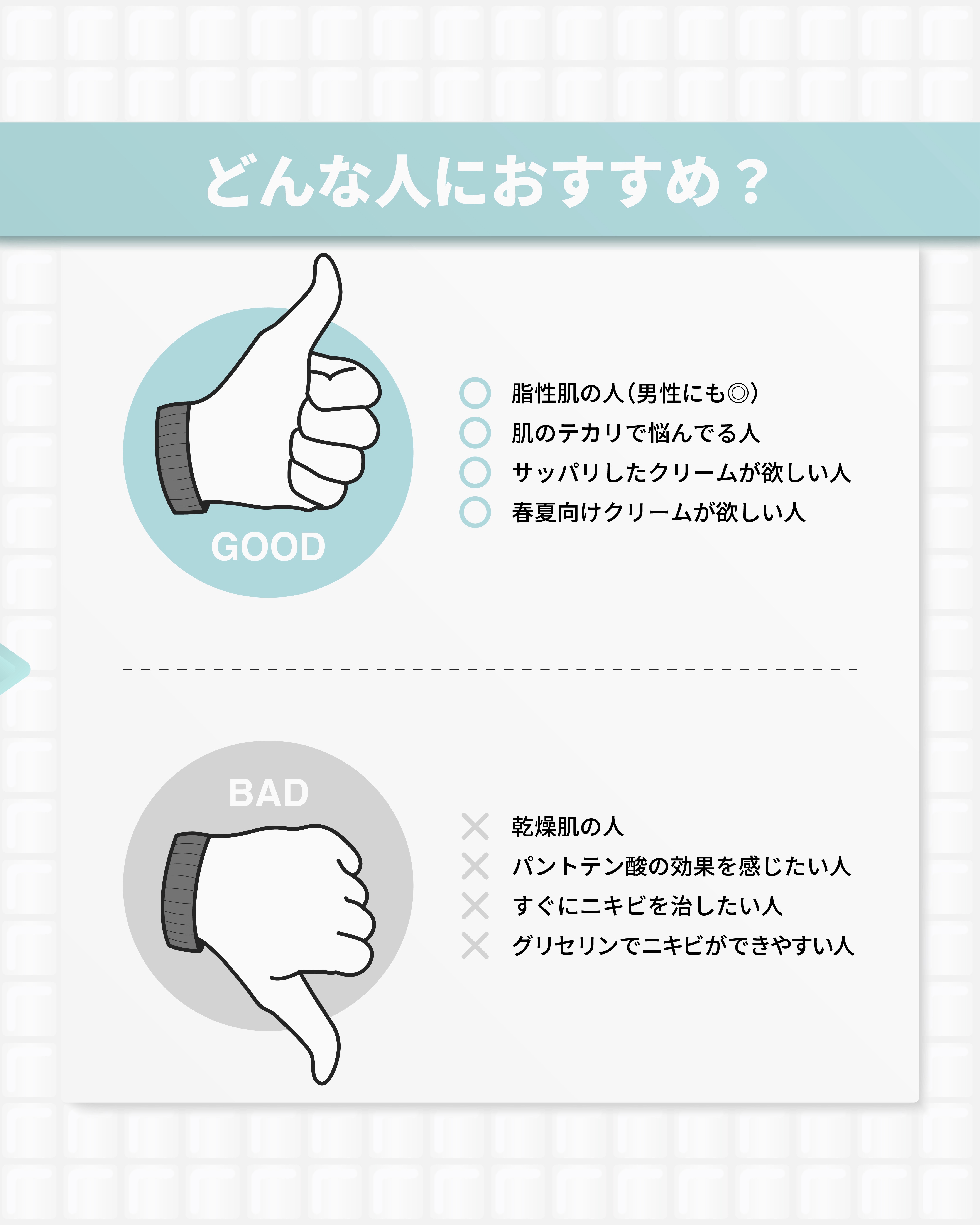 - ※2025年11月頃〜商品パッケージ順次リニューアル。尚、これにかかる商品の返品・交換は承っておりません。 皮脂悩みをケアして健やかに保つパントテン酸*の皮脂ターゲティング! 過剰皮脂による肌悩みにアプローチする皮脂ケアクリーム。 水分たっぷりのスージングテクスチャーで肌の油分と水分を保つクリーム 何度重ね塗りしてもベタつかず、さっぱり水分チャージ *整肌成分