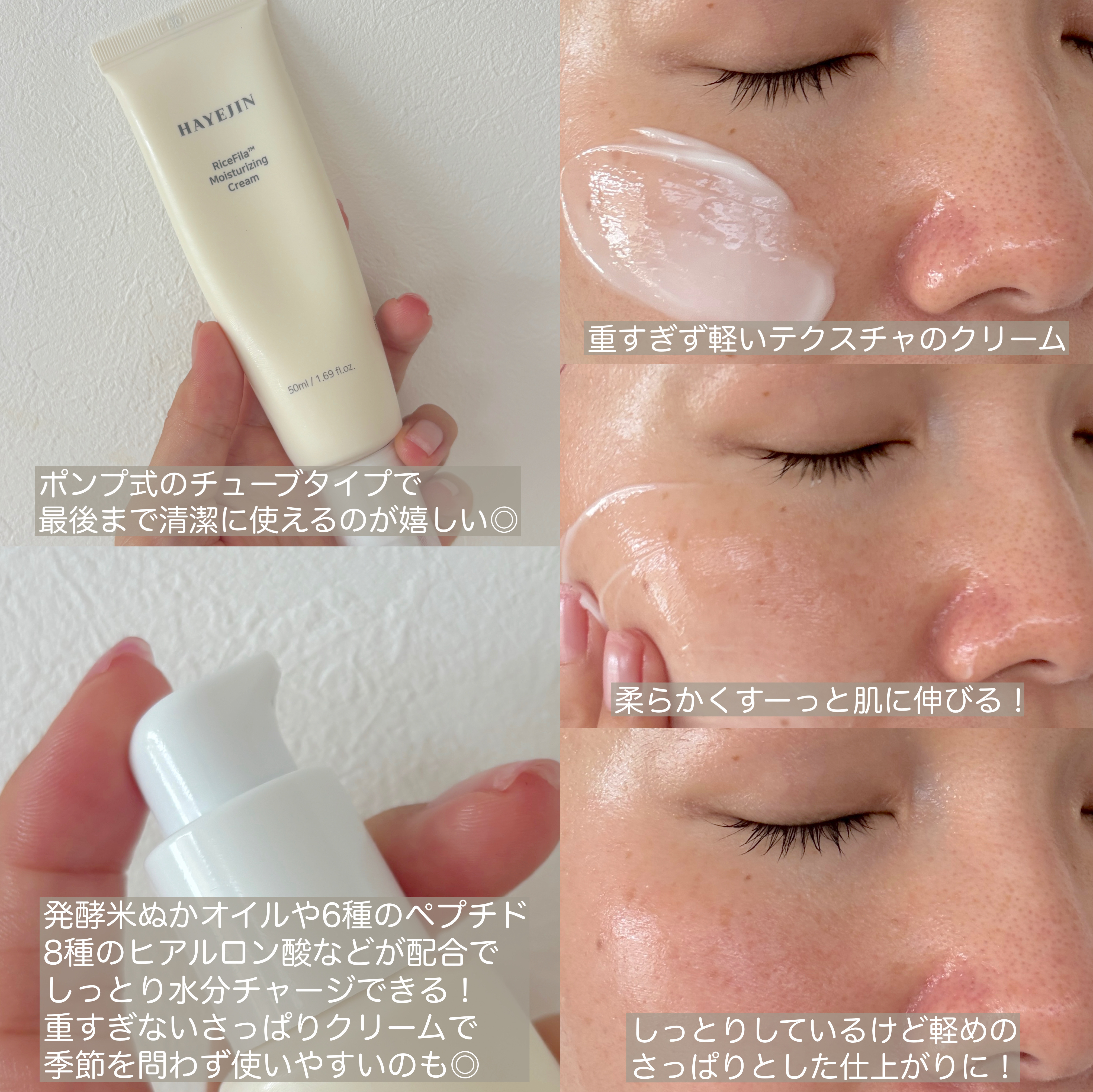 HAYEJIN【ライスフィラー保湿クリーム】軽いつけ心地なのにしっかり水分を与えてくれる保湿クリーム💕しっとり潤うのにベタつかない😍乾燥肌さんには少し物足りないかも…🤔💭そんな時は💡よりしっかりと保湿してくれる『ライスフィラーダブル保湿クリー...
