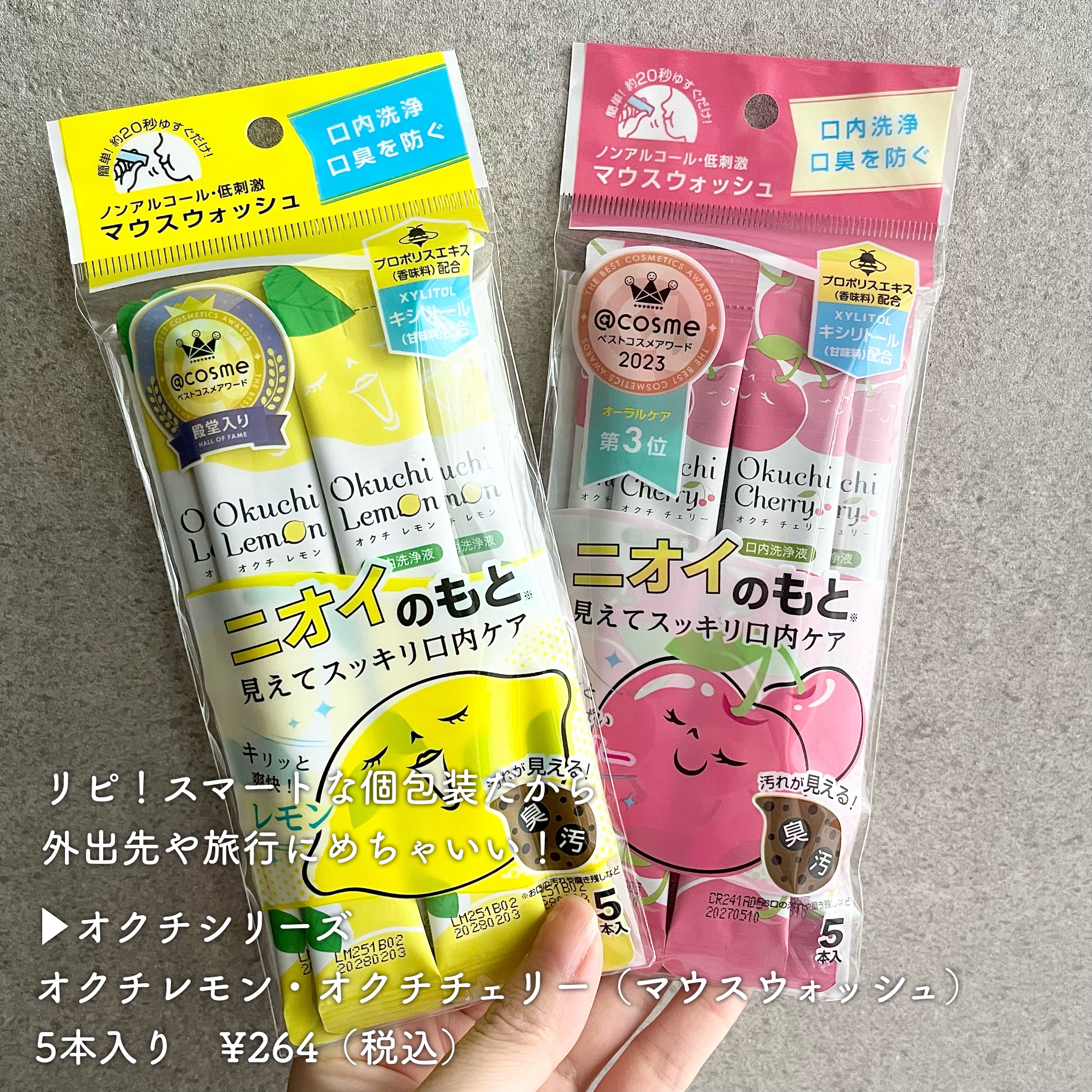 選べる福袋で、お店にあった全種類のオクチシリーズを購入🛒 1袋分264円×5袋1320円が1050円❣️ サンプルも付けてくれました 口の中の汚れ、磨き残しを除去し、口臭の原因の一つであるタンパク質を固めて洗い流す口内洗浄液です。 キュンと甘酸っぱいチェリー🍒 ノンアルコール・低刺激