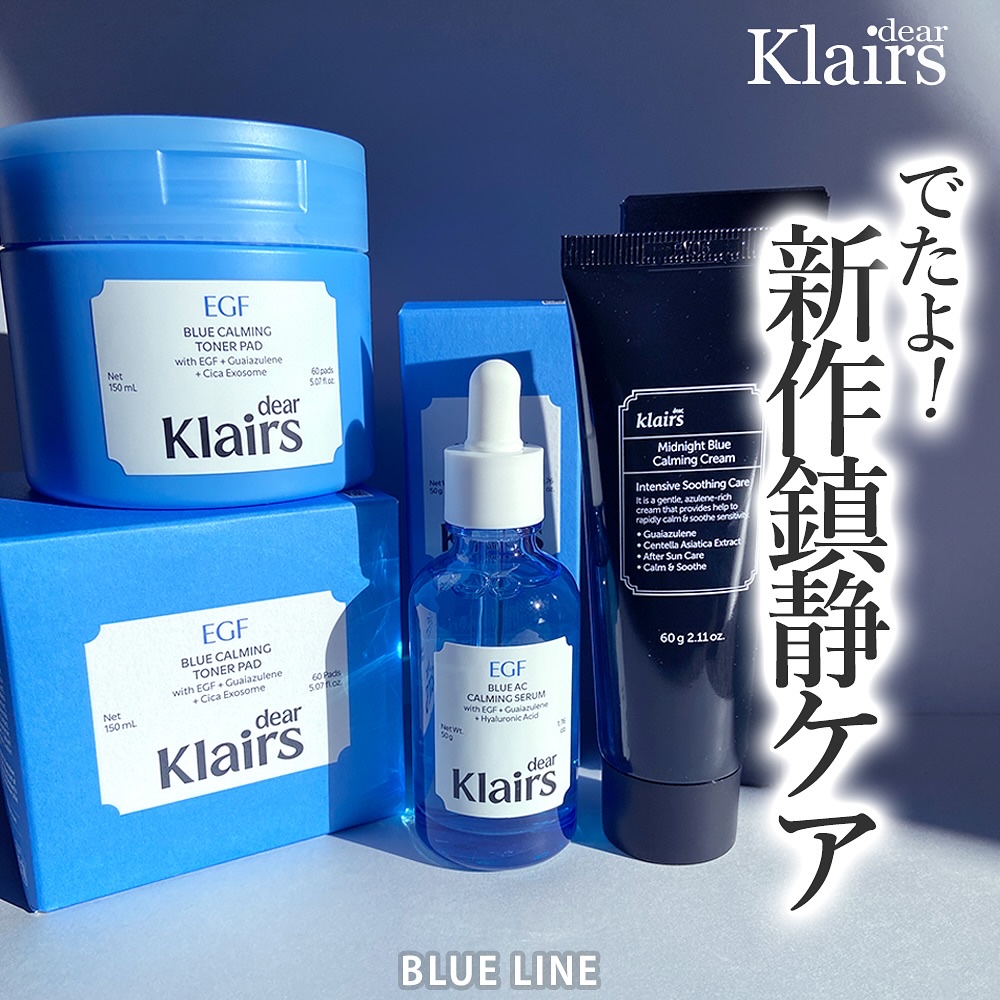 提供┆Klairs様〖ブルーカーミングライン〗青色が特徴的の“グアイアズレン”を配合したクレアスのブルーライン🫐.·グアイアズレンの他にEGFもプラスした新作のトナーパッド・美容液と、クレアス人気のクリーム🦋⌇EGFブルーカーミングトナーパッ...