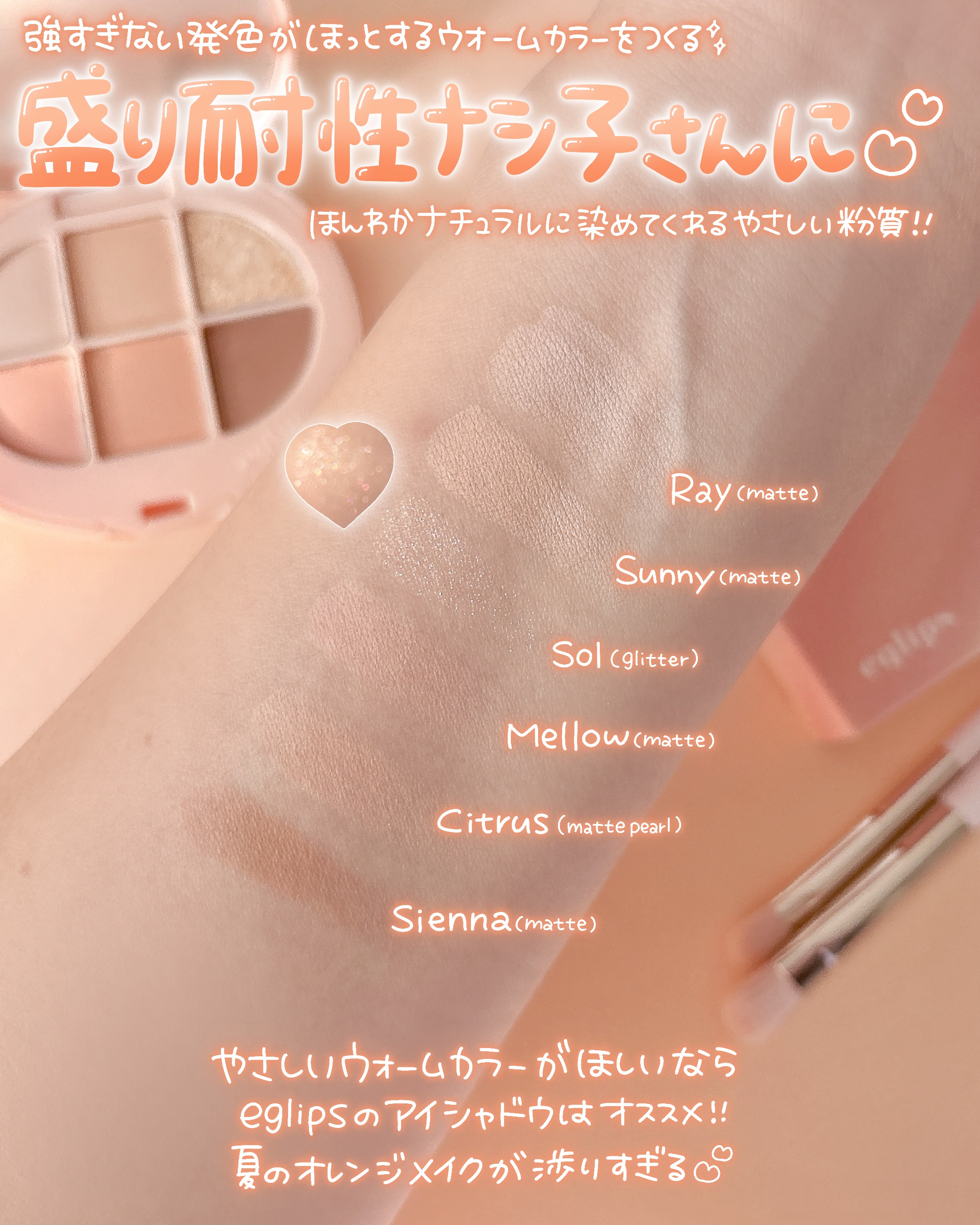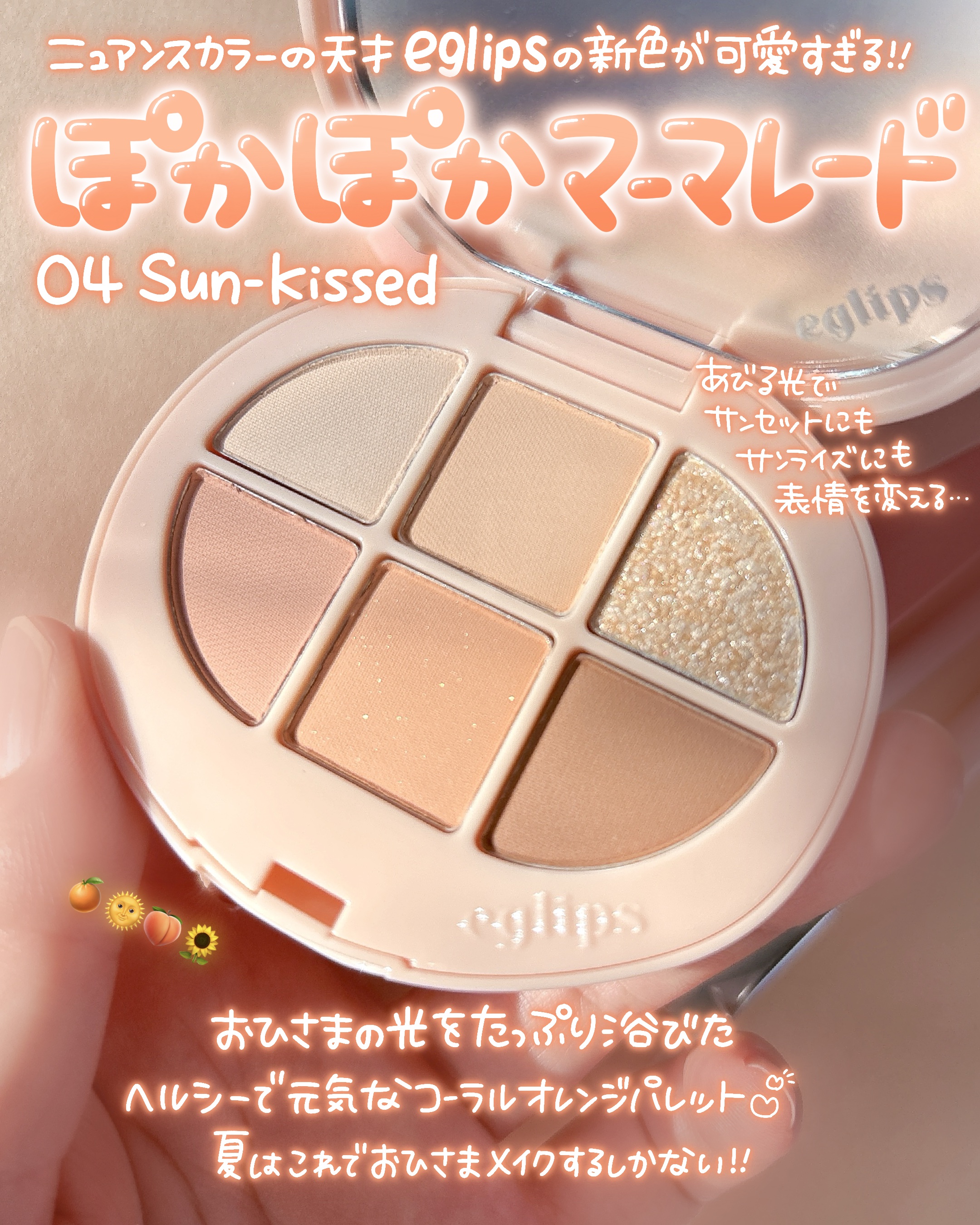 EGLIPSソフトアイパレット04SUN-KISSED夏にぴったり💯なコーラルオレンジカラーのアイシャドウパレット夏の太陽に愛される旬顔メイクが叶います💛組み合わせて使いやすい6色がセットされていて、ラメ入り以外はすべてマットです左上:①明る...