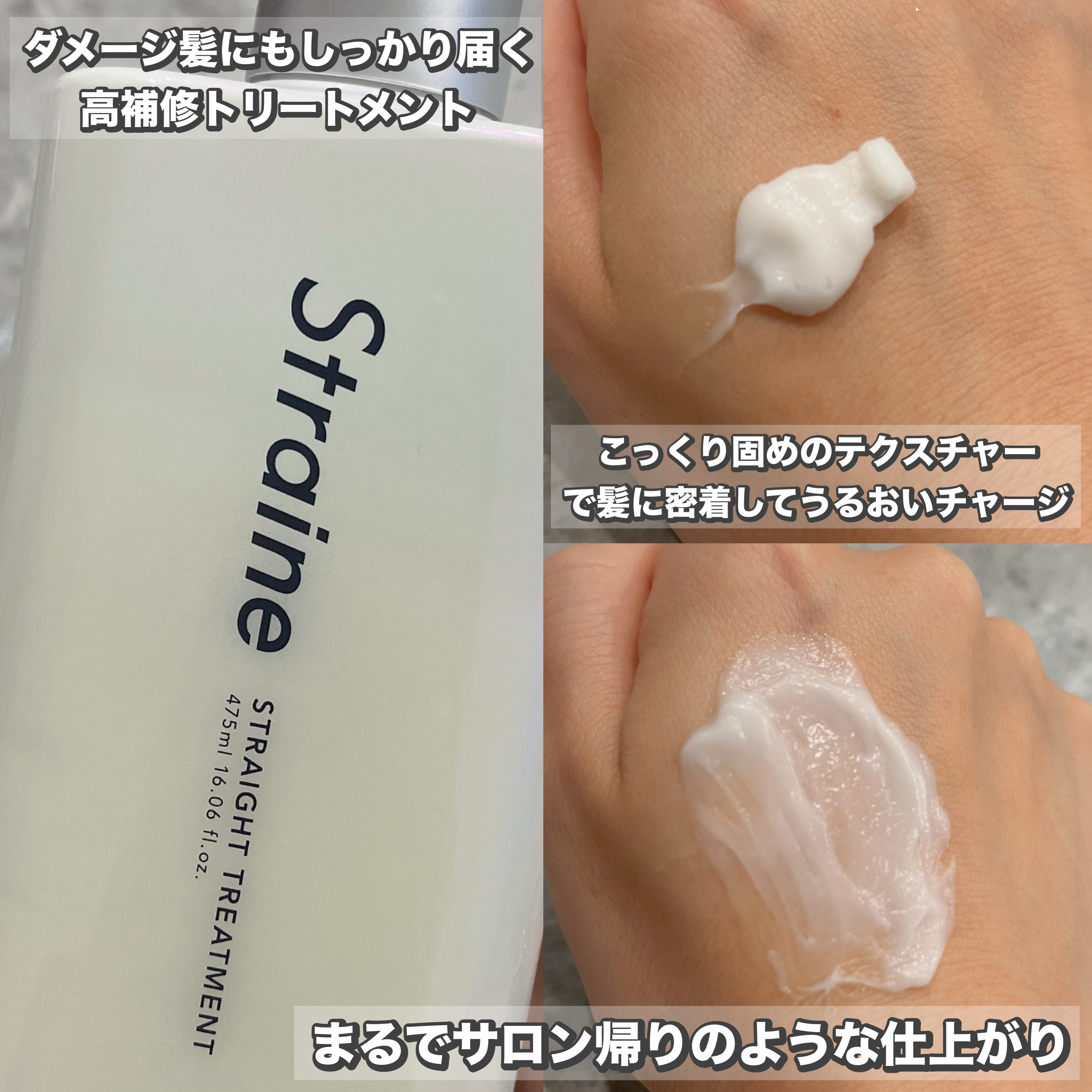 - “straight(真っ直ぐ)”と“line(線)”を組み合わせた造語「Straine」は、まるで一本の美しいラインのようにしなやかで整ったストレートヘアをイメージ。理想のストレート質感を目指し厳選した補修成分と内部構造に着目した独自の補修設計技術で、乾燥によるクセ・うねりケアに悩むすべての人へ、新しい自分との出会いをお届けする新ヘアケアブランドです。  ️髪の内部構造に着目した、独自の「トリプルストレート処方」 縮毛補修発想。髪の内側の構造に着目し、まっすぐまとまる髪を科学的に研究し導きだした3つの処方。 髪の構造を深く理解したアプローチで髪質を再整*1し、潤いを保ちながら、滑らかな指通りへ。 9種の必須アミノ酸*2と7種のケラチン*3を贅沢に配合し、髪内部を補修をしながら、理想の“シルクストレート質感*4 ”を目指します。  ️POINT01|内部補修 -髪内部のうねり原因を補修。まっすぐな髪を目指して。 髪のうねりの原因となる乾燥による内部構造の乱れを、必須アミノ酸*2を含むアミノ酸と密度補強成分「ジマレイン酸」*5で補修。さらに、縮毛補修発想から生まれた成分「トステア®」*6を配合し、ハリ・コシのあるストレート髪を目指します。  ️POINT02|シルク質感 ‐ダメージを立体補修 ダメージによって生まれた髪内部の空洞“ダメージホール”を、保湿成分である7種類の分子量の異なるケラチン*3が髪芯部まで浸透し、立体的に内側まで補修。PPT系高級洗浄成分*7が、髪1本1本を洗い上げ、しなやかで指通りなめらかな“シルクタッチ”の髪へと仕上げます。  ️POINT03|うるおいバリア ―湿気や熱から髪を守る 湿気によるうねりを防ぐために、5種のセラミド*8とサクラン®*9で髪内部の水分をキープ。さらに、熱に反応してバリアを形成する「γ-ドコサラクトン」*10と、キューティクルを保護する「擬似18-MEA」*11が外的ダメージから髪を守り、湿気から髪を保護しながらストレート状態を長時間キープします。  ️凛とした透明感が香り立つホワイトブロッサムの香り サロン帰りのような心地よさを、毎日のバスタイムに。フレッシュなフローラルと果実の爽やかさが調和した、みずみずしく上品な香りです。 *1 うるおいにより、髪の質感を整えること *2 バリン、トレオニン、イソロイシン、ヒスチジン、フェニルアラニン、ロイシン、リシンHCl、メチオニン、トリプトファン(全て保湿) *3 加水分解ケラチン(カシミヤヤギ)、ヒドロキシプロピルトリモニウム加水分解ケラチン(羊毛)、(ジヒドロキシメチルシリルプロポキシ)ヒドロキシプロピル加水分解ケラチン(羊毛)、ココジモニウムヒドロキシプロピル加水分解ケラチン(羊毛)、イソステアロイル加水分解ケラチン(羊毛)、加水分解ケラチン(羊毛)、ケラチン(全て保湿) *4 うるおいによる、なめらかな質感のこと *5 ジマレイン酸プロピレンジアンモニウム(保湿) *6 アミノエチルチオコハク酸ジアンモニウム(保湿) *7 ココイル加水分解ケラチンK(羊毛)(洗浄) *8 セラミドNG、セラミドAP、セラミドAG、セラミドNP、セラミドEOP(全て保湿) *9 スイゼンジノリ多糖体(保湿) *10 (保湿) *11 セテアラミドエチルジエトニウム加水分解コメタンパク、ラノリン脂肪酸(保湿)