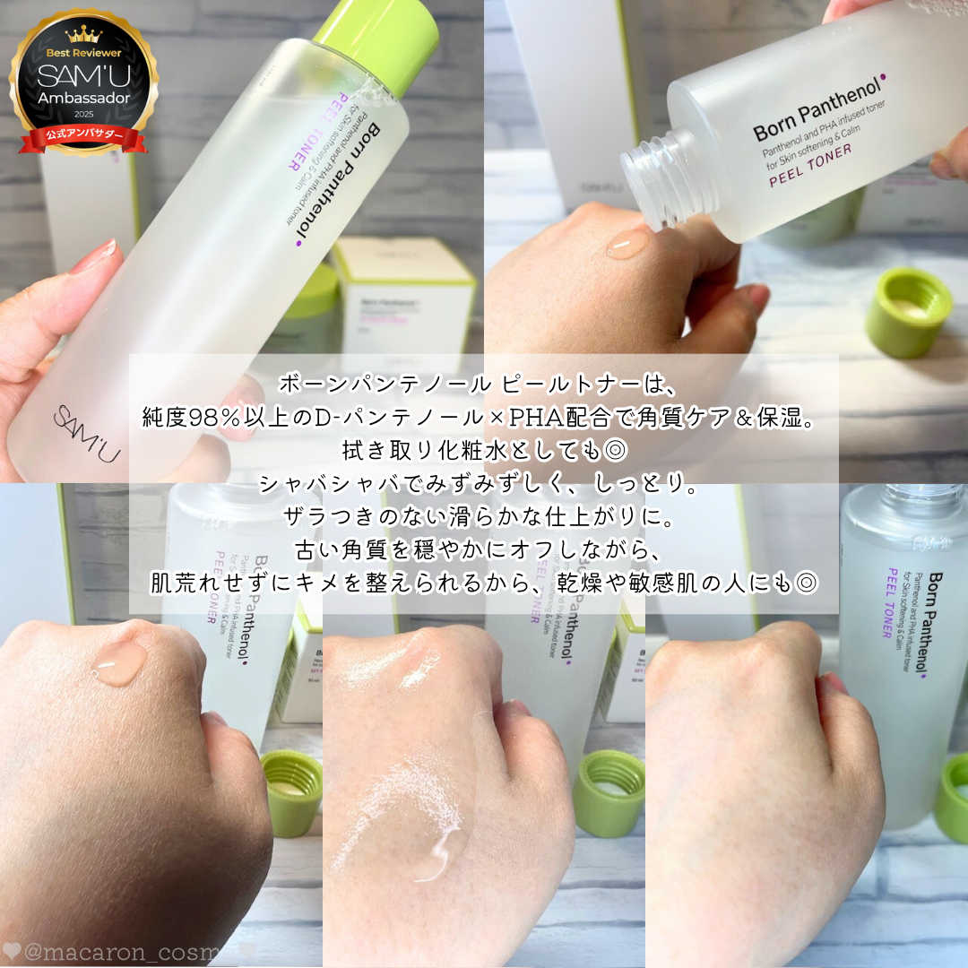 ..サミュ公式アンバサダーとしての投稿です!今回はボーンパンテノールラインの中からトナーとクリームのご紹介✨️💚ボーンパンテノールピールトナー敏感肌さんも安心して使えるトリプルスージングトナー。*純度100%D-パンテノール配合で一般的なDL...
