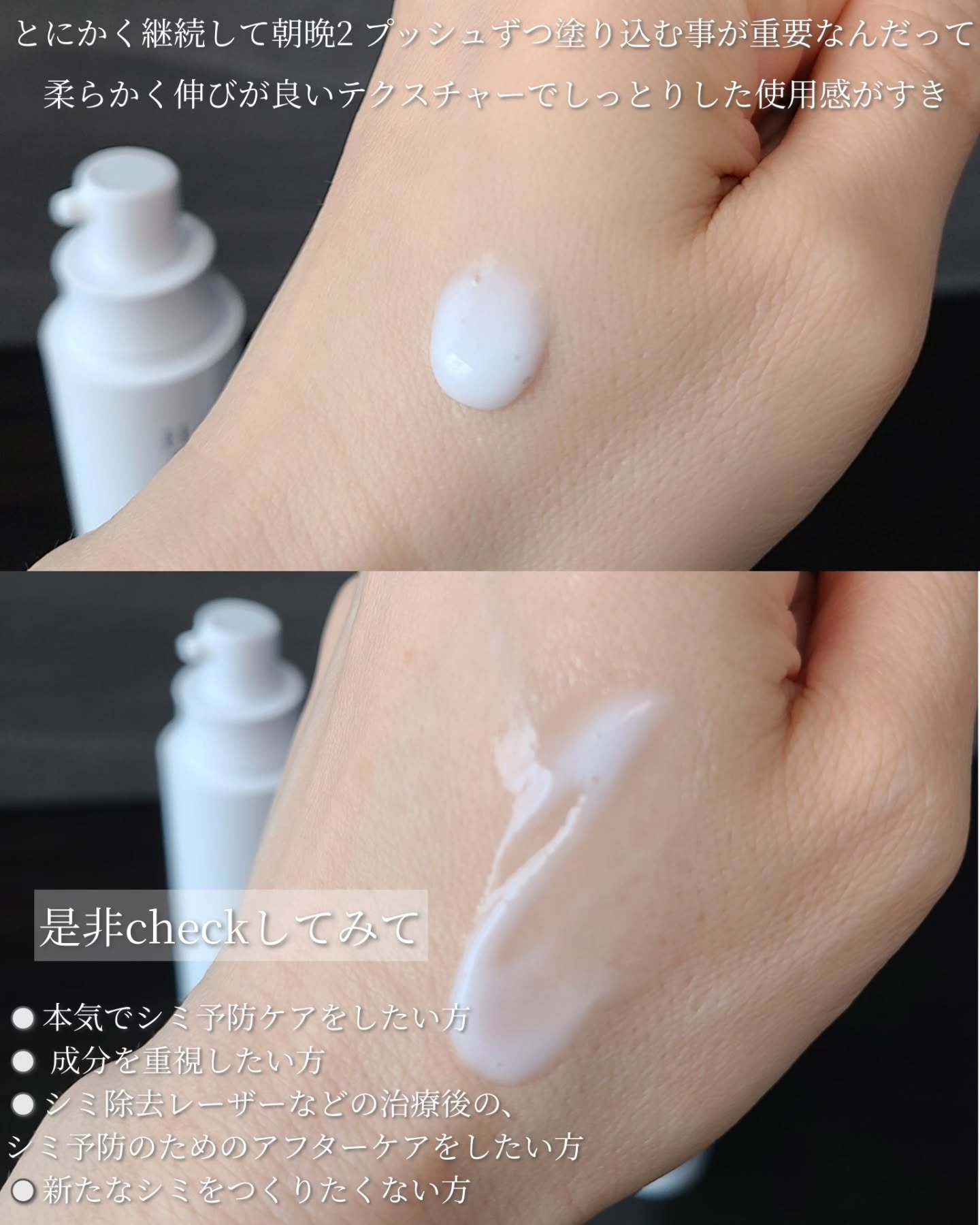 - 【医薬部外品】 シミができる根本原因を徹底的に研究。 「頑固なシミ」に先回り。つくらない増やさない。 シミの原因に根本から効かせる2種の美白有効成分(4MSK*、m-トラネキサム酸**)がメラニンの生成を抑え、シミ・そばかすを防ぐ。 有効成分グリチルリチン酸ジカリウムが炎症を抑え、肌あれを予防する。 使用方法: ●朝・夜の化粧水の後に、ディスペンサー2回押し分を手にとり、顔全体に広げます。 ●気になる部分を中心に軽くおさえ、顔全体にていねいになじませます。 使用上注意: ◇日焼け後は、肌の赤みやひりつきがおさまってからお使いください。 ◇使い始めは、中味が出るまでディスペンサーを数回押してください。 ◇ご使用後は、ディスペンサーの口もとをきれいに拭き、キャップをきちんと閉めてください。 ◇気密性を持たせた特殊な内容器を採用しています。使用途中で内容器からディスペンサーを外すと、中味が出なくなることがありますので、取り外さないでください。 ◇直射日光にあたってお肌に異常があらわれたときには、ご使用をおやめください。 ◇日のあたるところや高温のところに置かないでください。 ◇中味の性質上、色の見え方に差が生じる場合がありますが、安心してお使いいただけます。 *4-メトキシサリチル酸カリウム塩 **トラネキサム酸