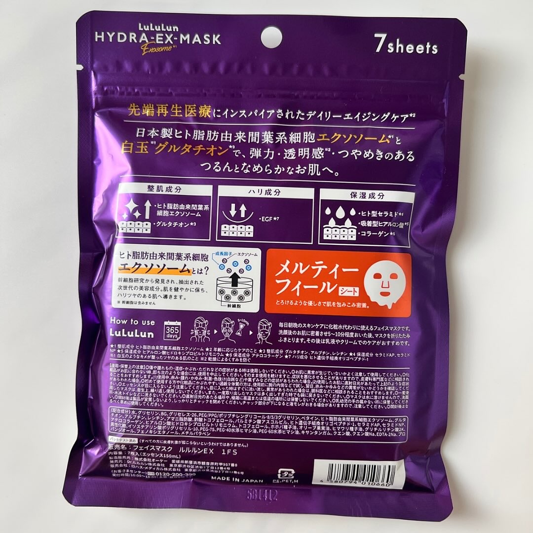 - ルルルンハイドラシリーズから新登場。うるおいにプラスするのは、「エクソソーム*1」。先端再生テクノロジーにインスパイアされた、デイリーエイジングケア※1マスクです。白玉※2グルタチオン*2をプラス配合し、弾力・透明感※3・つやめきのあるなめらかなお肌へ導きます。 (*1 整肌成分 ヒト脂肪由来間葉系細胞エクソソーム *2 整肌成分 グルタチオン、アルブチン、レシチン ※1 年齢に応じて肌へうるおいと弾力を与えるケアのこと ※2 白玉のようなキメが整ったツヤのある肌のこと ※3 うるおいを与えて、乾燥によるくすみを防ぐ)