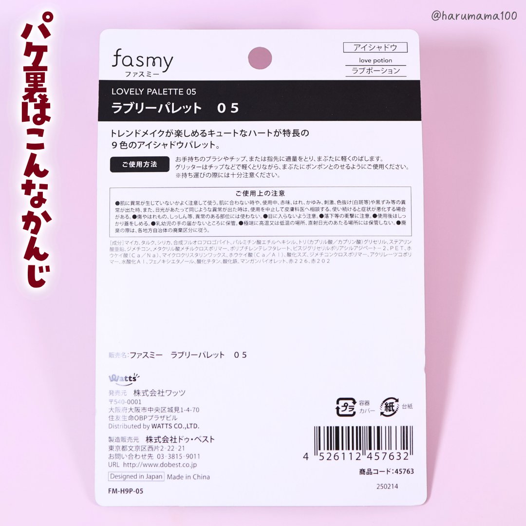 \百均で買ったよ!/♡••••♡ワッツファスミーラブリーパレット05ラブポーション♡••••♡百均のワッツでかったパレットでメイクしたよ!百均だから安いと思ったら385円もしたけど!w高めなだけあって、やっぱり普通の百均パレットよりは粉質がき...