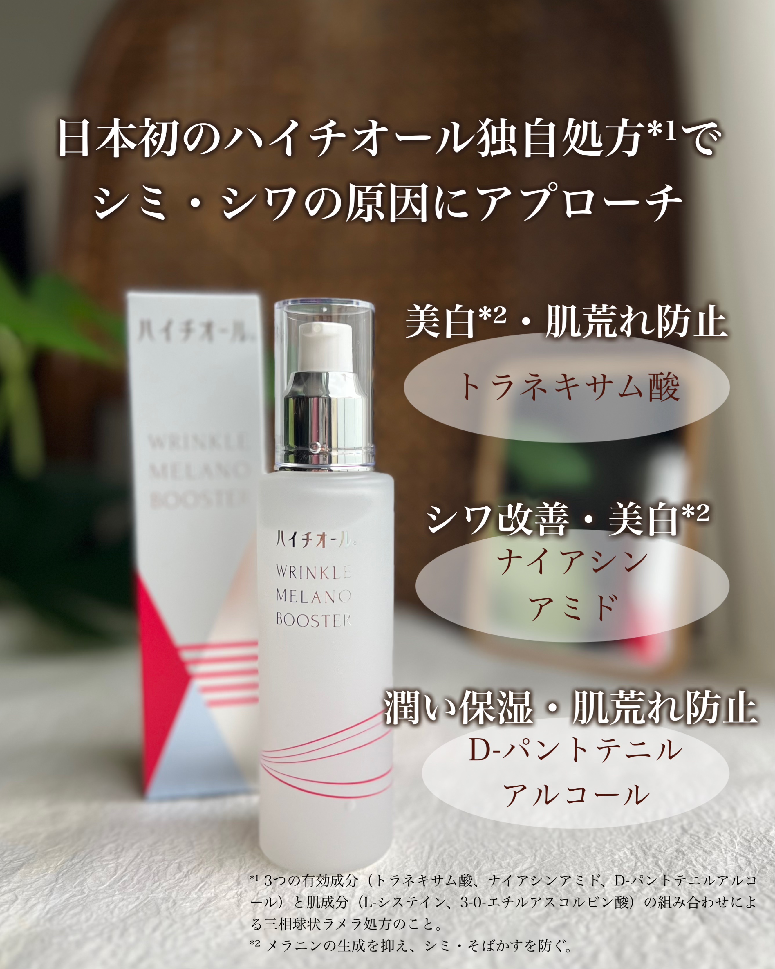 - EC 限定【医薬部外品】 シミ研究 50 年以上の知見をスキンケアに踏襲して開発したハイチオール史上初の薬用導入美容液「ハイチオール リンクルメラノブースター」。厳選された3つの有効成分(トラネキサム酸/ナイアシンアミド/D-パントテニルアルコール)と日本初のハイチオール独自処方でシミ・シワの原因にアプローチします。また、整肌成分として L-システインとビタミン C 誘導体(3-O-エチルアスコルビン酸)を配合しています。さらに、三相球状ラメラ技術により肌に潤いを与え、ナノカプセルに閉じ込めたブナエキス※1 が肌の奥※2 まで浸透し、うるおいが持続します。 ベタつかないのに、しっかりうるおう使用感とほのかに香るさわやかなシトラスのフレグランスがあなたを癒します。 ※1 保湿成分 ※2 角層まで