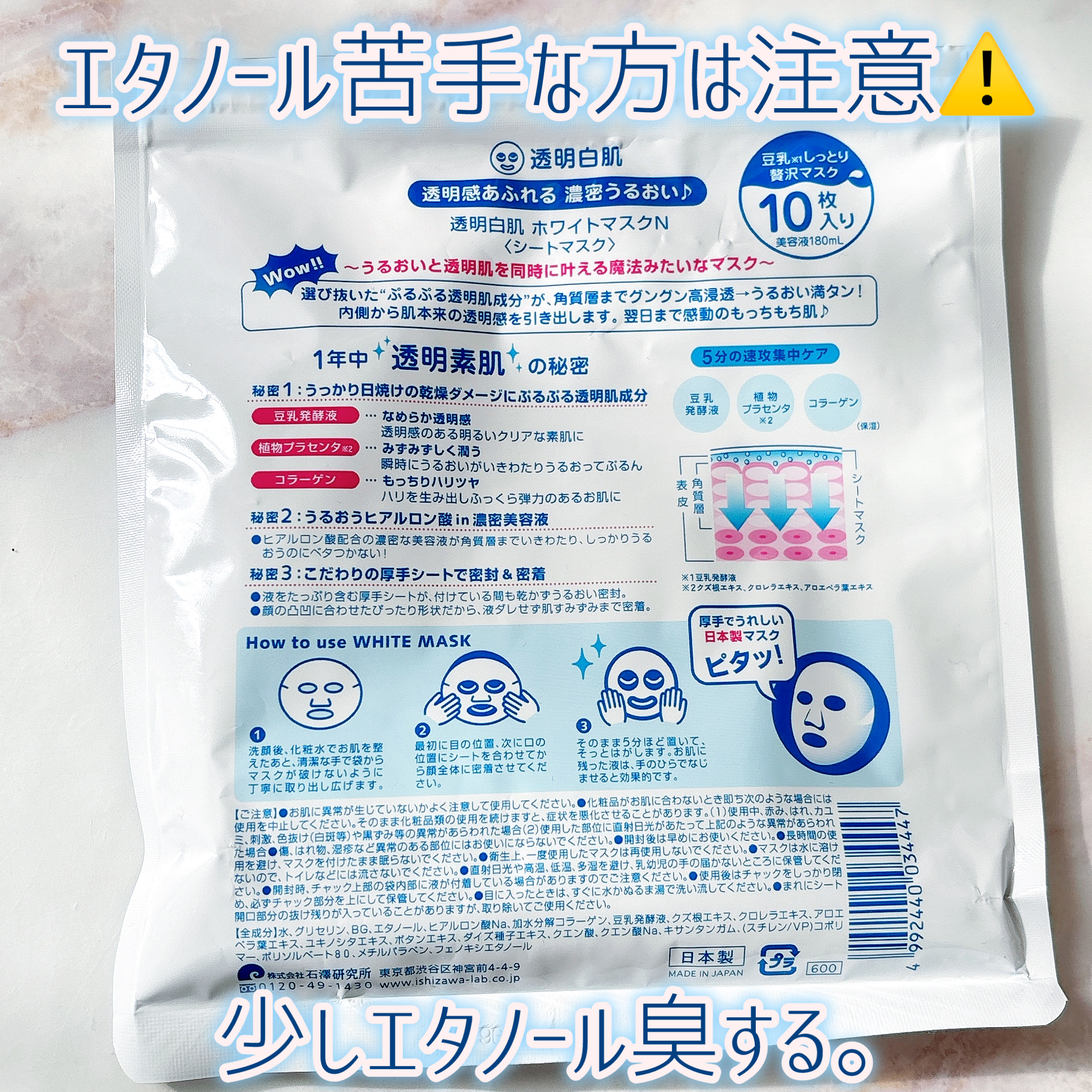 - <ホワイトマスクN> 水、グリセリン、BG、エタノール、ヒアルロン酸Na、加水分解コラーゲン、豆乳発酵液、クズ根エキス、クロレラエキス、アロエベラ葉エキス、ユキノシタエキス、ボタンエキス、ダイズ種子エキス、クエン酸、クエン酸Na、キサンタンガム、(スチレン/VP)コポリマー、ポリソルベート80、メチルパラベン、フェノキシエタノール