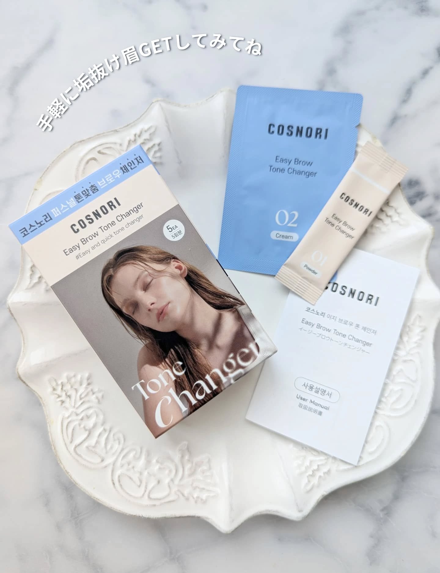 \手軽に簡単眉脱色/COSNORIイージーブロウトーンチェンジャー¥2860(Qoo10調べ)混ぜ合わせるだけで簡単、アイブロウ脱色✨01パウダーを02のクリームの中に入れて付属のブラシで混ぜるだけ眉にのせて3分で脱色完了!置き時間は3分を目...