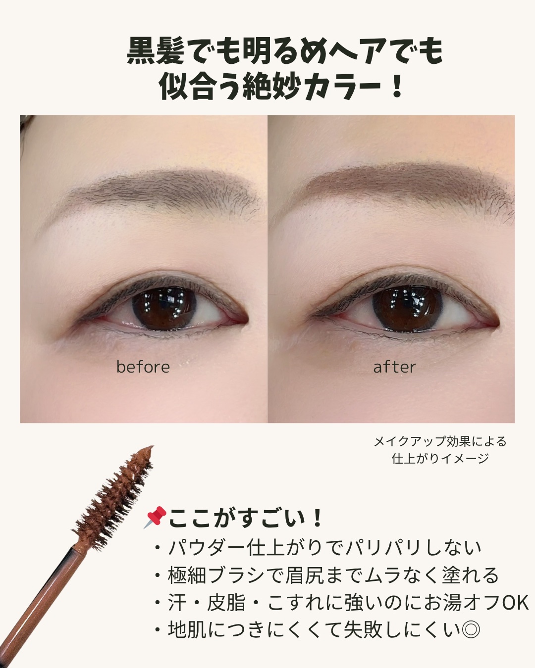 - 自眉の黒をやわらげて、ふんわり自然に仕上がる。#脱色級※眉マスカラ。 1自眉の「黒」を抑える発色 自眉の黒を抑えるパールを配合、高発色な色づきを実現 2軽やかなパウダリー仕上がり 粉体をたっぷり含んだ液だから乾いた後パリパリしにくい ふんわり軽やかなパウダリー仕上がりに 3自然な自眉感カラー さりげなく自眉になりすますやわらかなグレイッシュカラー 毛質をソフトに見せながら自然に色づける 4地肌につきにくい小回りブラシ ●ひと塗りでしっかり色づける ●目もとの凹凸にフィットして眉頭・眉尻まで塗りやすく地肌につきにくい ◆汗、皮脂、こすれに強い ◆お湯オフタイプ ※脱色したような色合い