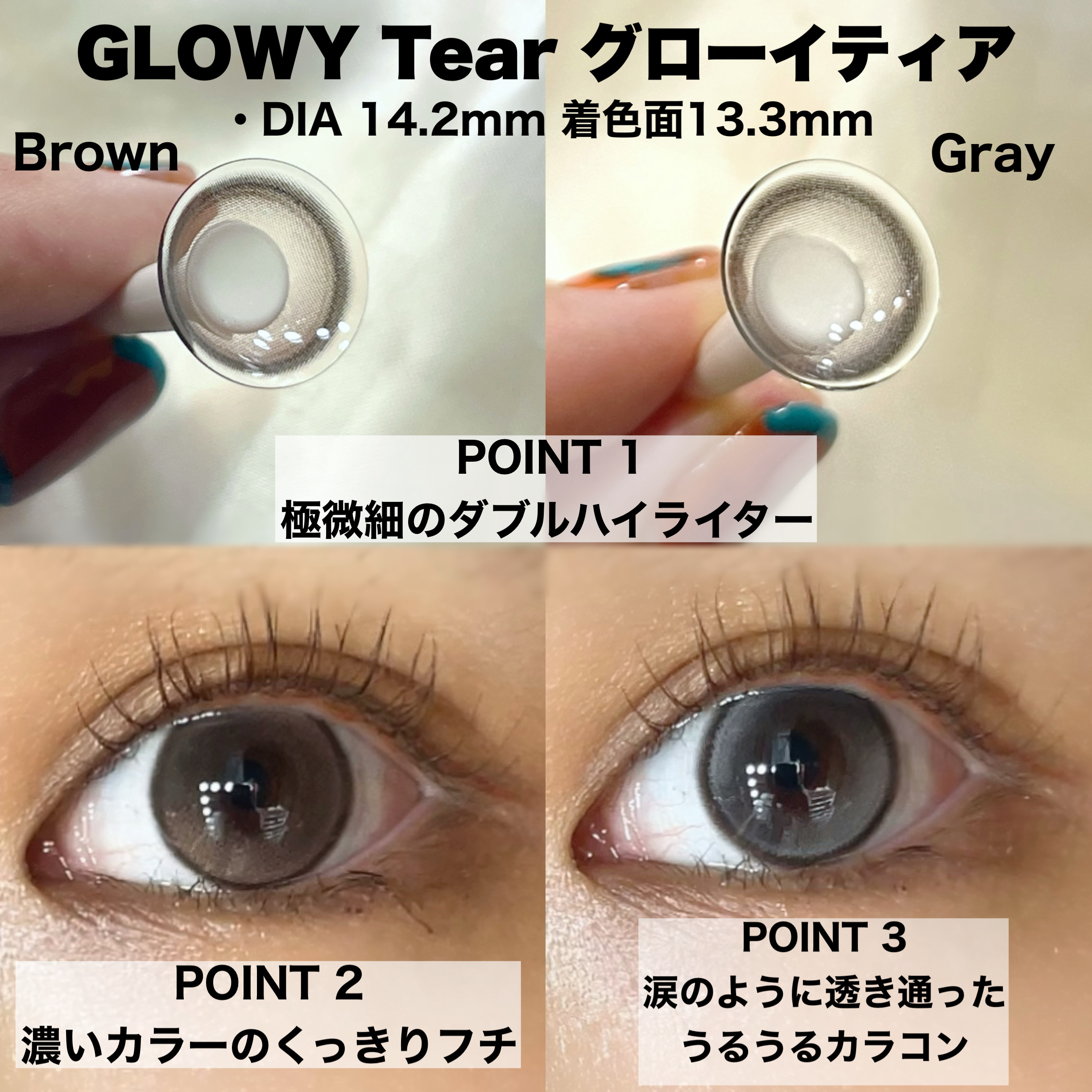 ˏˋ涙のようなうるうるダブルハイライトカラコンˎˊ˗✼••┈┈••✼••┈┈••✼••┈┈••✼••┈┈••✼✼••┈┈••✼••┈┈••✼••┈┈••✼••┈┈••✼‹ɪᴛᴇᴍ›OLENSGlowytear‐ブラウン‐グレー・比較に使用した...