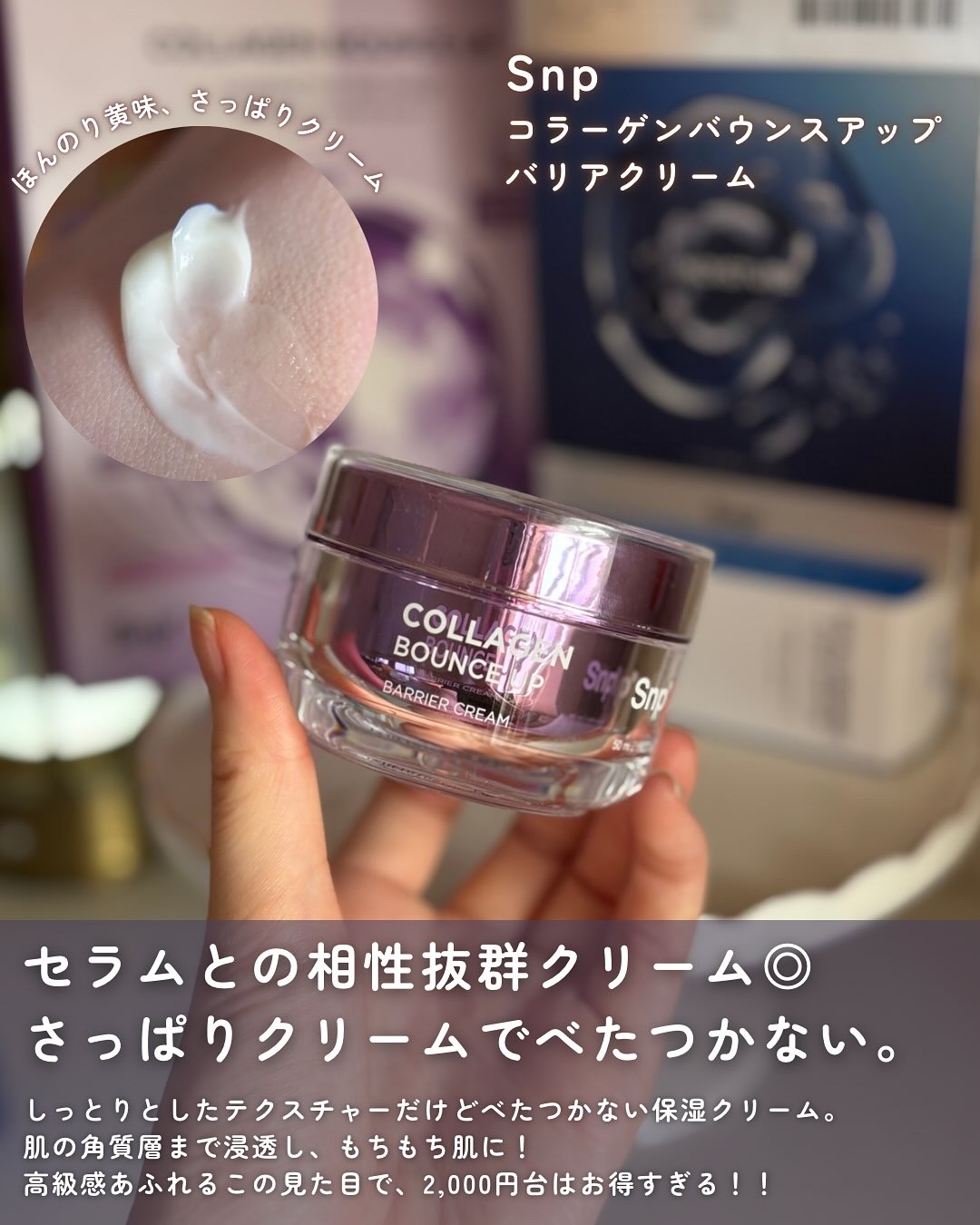 Snpのテンションクリーム×マスクの組み合わせが好き!コラーゲンバウンスアップバリアクリームとコラーゲンバウンスアップハイパーアクティブゲルマスククリームは125ダルトンの超低分子コラーゲン※配合で、翌朝の肌が何だか元気に見える感じが嬉しい◎...