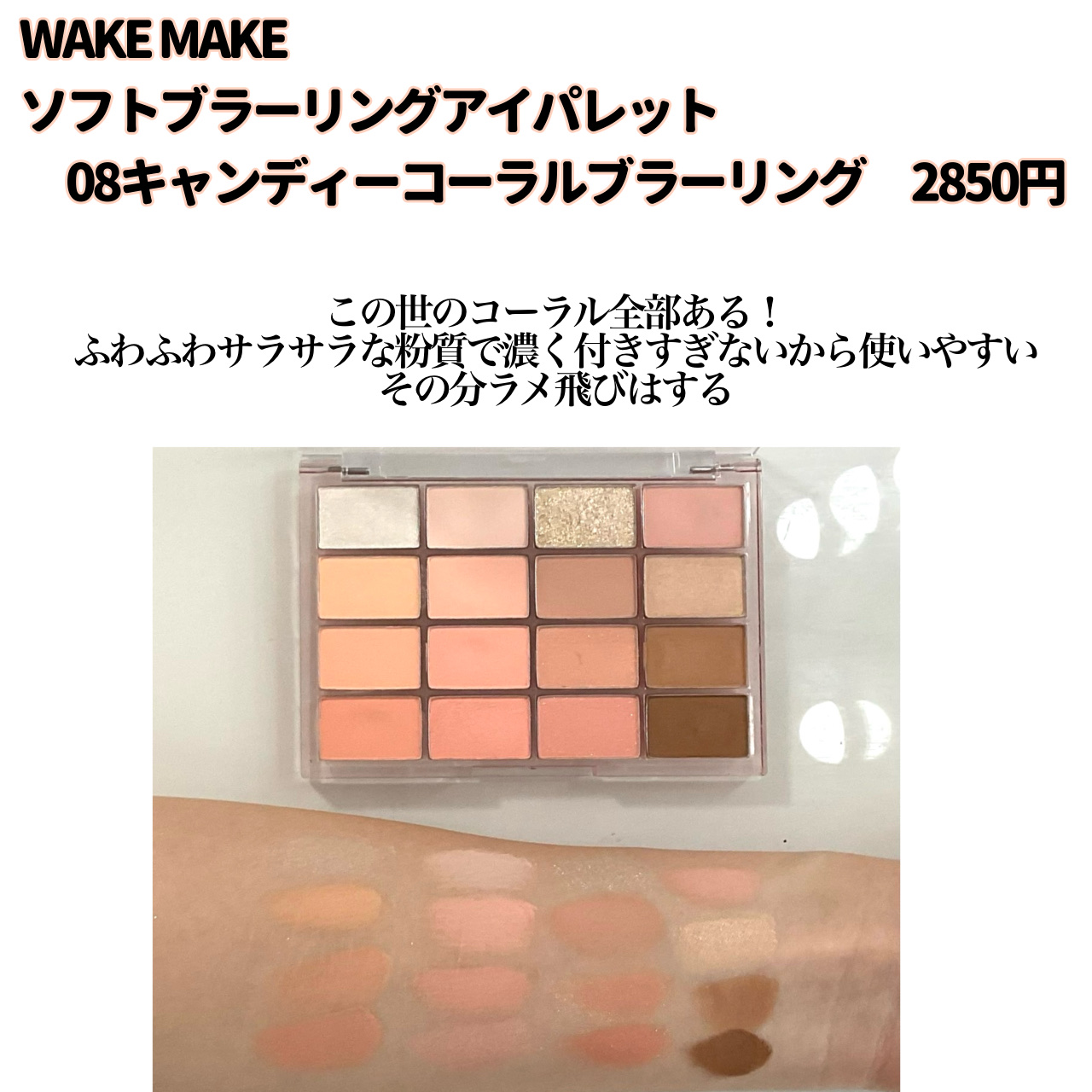【📌保存版】イエベ春おすすめ韓国ピーチコーラルパレット図鑑🍑公式画像と実物の色味に差がある場合があるので、実物の画像も撮影しました!・WAKEMAKEソフトブラーリングアイパレット07ソーダコーラルブラーリング・WAKEMAKEソフトブ...