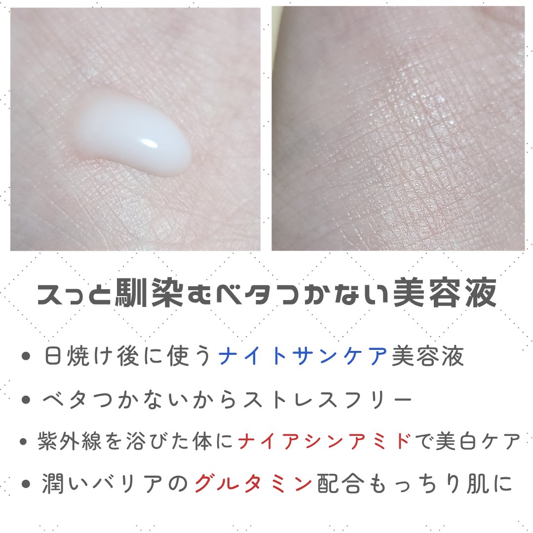 - 【医薬部外品】紫外線ダメージが気になる日の夜に、これ1本でうるおいながら全身の美白※1ケア&シワ改善薬用 ナイトサンケア美容液 ※1 美白とは、メラニンの生成を抑えシミ・そばかすを防ぐこと 紫外線ダメージが気になる肌に就寝中のうるおいケア。美白ケア※1&シワ改善まで。 たっぷりのうるおいで肌の天然バリア膜(角層)を整え、明るく透明感のある肌に導く。 1本で顔・首・腕など全身に使える薬用オールインワン美容液。 ○美白※1&シワ改善有効成分-ナイアシンアミド ○肌あれ防止有効成分-グリチルリチン酸塩 ○うるおいバリア成分-D-グルタミン酸 ○保湿成分:アロエベラエキス、明日葉エキス、緑茶エキス、トルメンチラエキス、グリセリン ○長時間保湿持続効果 ○さらっとした使用感でべたつかない ○すっとなじむ美容液 ○清々しいハーバルグリーン&ラベンダーの心地よい香り ○つめかえ可能なレフィル仕様 ○責任ある木質資源を使用したFSC®認証紙パッケージ ■使用法 ◆洗顔後やお風呂上がりに、お使いください。 ◆顔・首・腕など紫外線の浴びやすい部分を中心に適量を塗り広げてください。 ◆化粧水・乳液・美容液の機能を兼ね備えたオールインワン美容液であるため、これ1本でスキンケアを完了させることができます。お手持ちのスキンケアと合わせてお使いになる場合は、化粧水の後の使用をおすすめします。 ◆「冷やしアネッサ」:冷蔵庫で冷やしてお使いいただくことで清涼感もアップし清々しい使い心地を楽しんでいただくことができます。